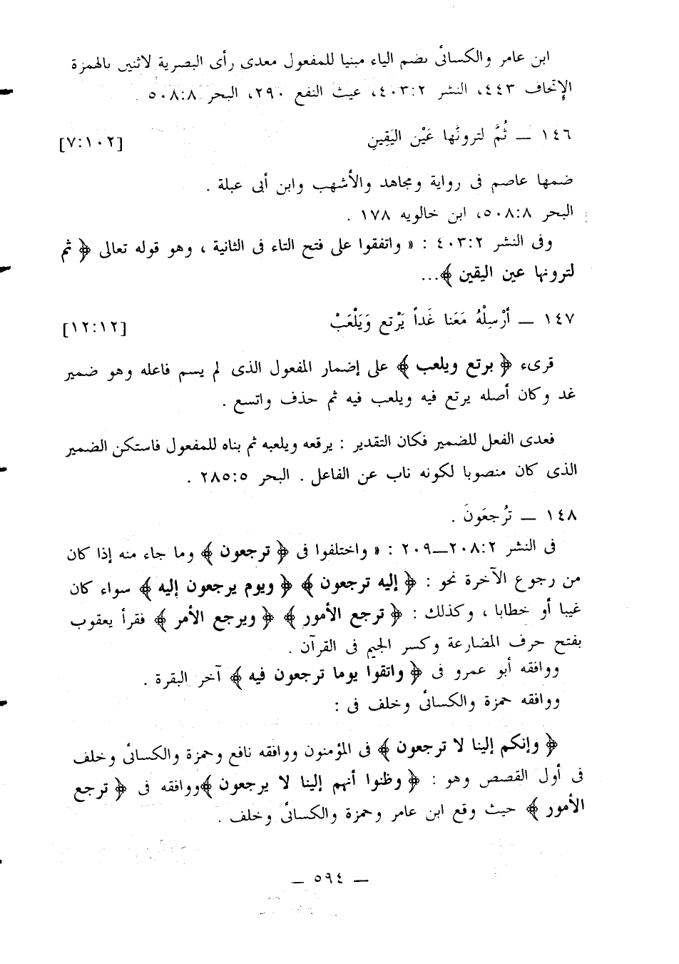 في النشر 2: 208 - 209: «واختلفوا في {ترجعون} وما جاء منه إذا كان من رجوع الآخرة نحو: {إليه ترجعون} {ويوم يرجعون إليه} سواء كان غيبا أو خطابا، وكذلك: {ترجع الأمور} {ويرجع الأمر} فقرأ يعقوب بفتح حرف المضارعة وكسر الجيم في القرآن.