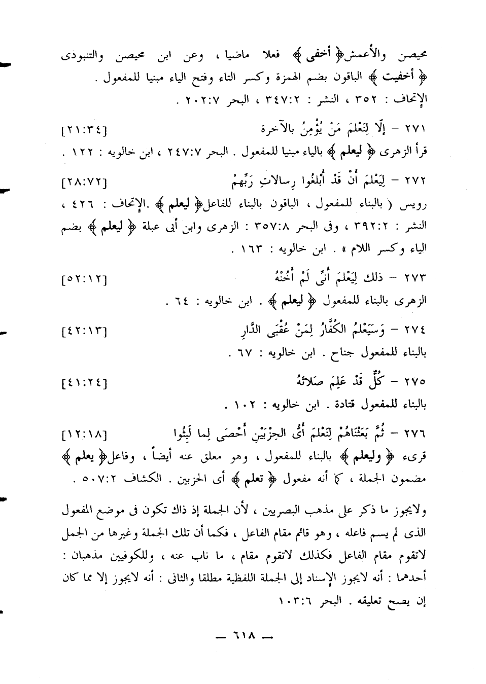 رويس (بالبناء للمفعول، الباقون بالبناء للفاعل {ليعلم} الإتحاف: 426، النشر: 2: 392، وفي البحر 8: 357: الزهري وابن أبي عبلة {ليعلم} بضم الياء وكسر اللام. ابن خالويه: 163.
