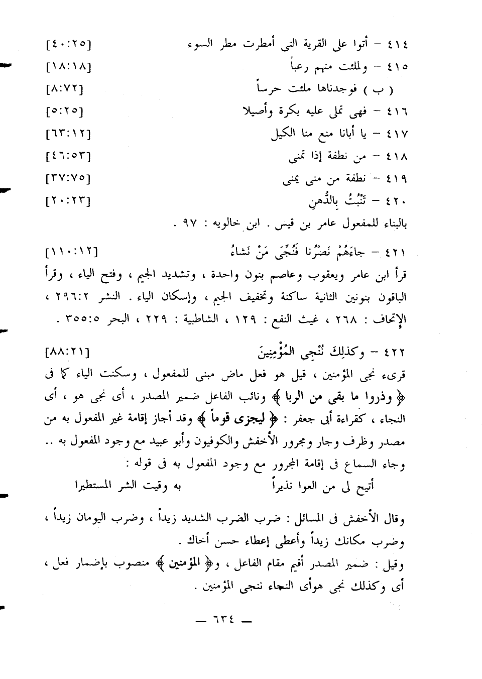 قرئ نجي المؤمنين، قيل هو فعل ماض مبني للمفعول، وسكنت الياء كما في {وذروا ما بقى من الربا} ونائب الفاعل ضمير المصدر، أي نجى هو، أي النجاء، كقراءة أبي جعفر: {ليجزي قومًا} وقد أجاز إقامة غير المفعول به من مصدر وظرف وجار ومجرور الأخفش والكوفيون وأبو عبيد مع وجود المفعول به. . . وجاء السماع في إقامة المجرور مع وجود المفعول به في قوله: