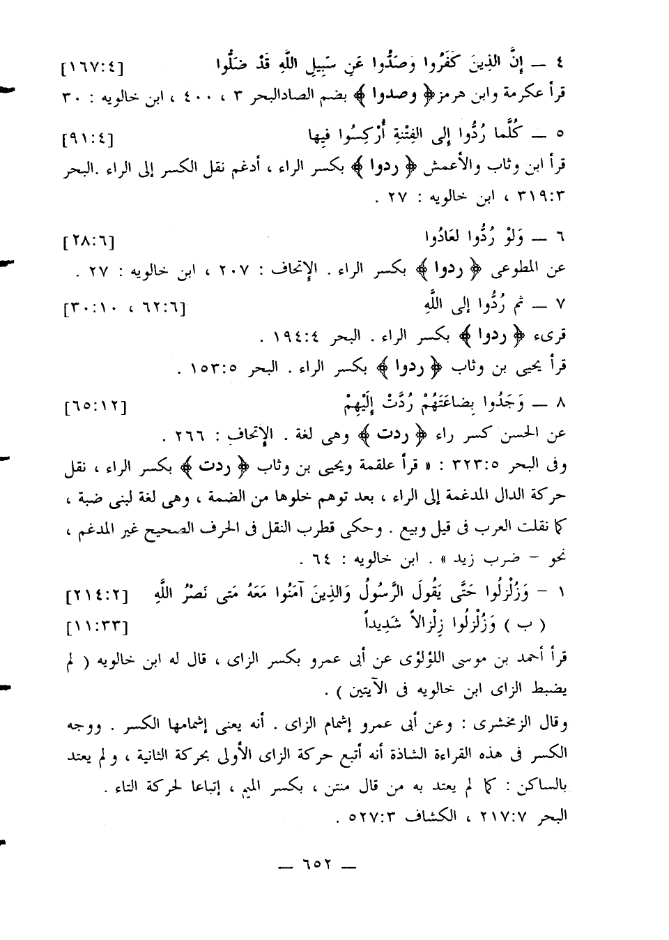 وفي البحر 5: 323: «قرأ علقمة ويحيى بن وثاب {ردت} بكسر الراء، نقل حركة الدال المدغمة إلى الراء، بعد توهم خلوها من الضمة، وهي لغة لبني ضبة، كما نقلت العرب في قيل وبيع. وحكى قطرب النقل في الحرف الصحيح غير المدغم، نحو - ضرب زيد». ابن خالويه: 64.