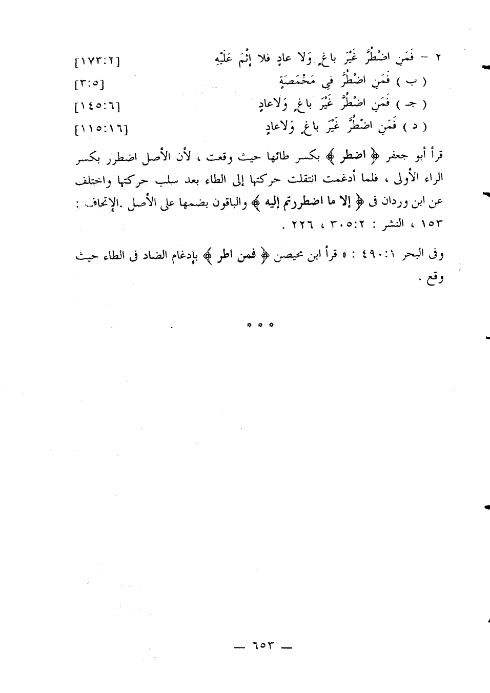 قرأ أبو جعفر {اضطر} بكسر طائها حيث وقعت، لأن الأصل اضطرر بكسر الراء الأولى، فلما أدغمت انتقلت حركتها إلى الطاء بعد سلب حركتها واختلف عن ابن وردان في {إلا ما اضطررتم إليه} والباقون بضمها على الأصل. الإتحاف: 153، النشر 2: 305، 226.
