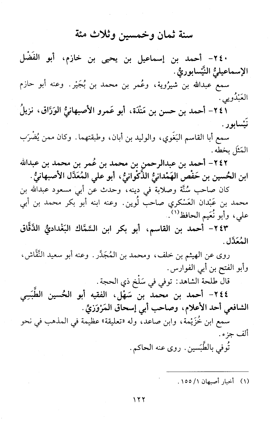 242 - أحمد بن عبد الرحمن بن محمد بْن عُمَر بْن محمد بْن عبد الله بن الحسين بن حفص الهمداني الذكواني، أبو علي المعدّل الأصبهاني. [المتوفى: 358 هـ]