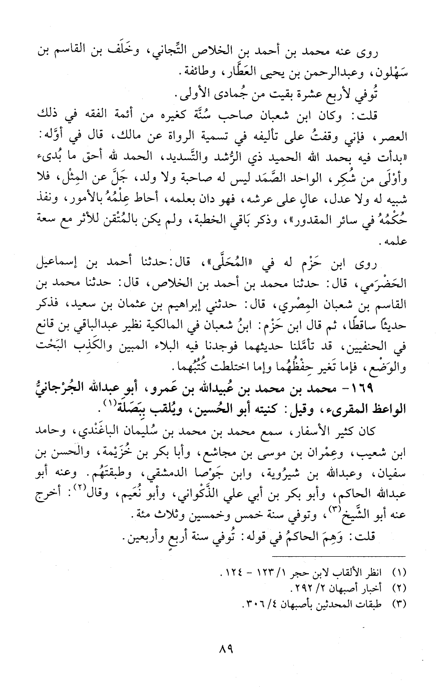 169 - محمد بن محمد بن عُبيد اللَّه بن عمرو، أبو عبد الله الْجُرْجاني الواعظ المقرئ، وقيل: كنيته أبو الحُسَين، ويُلقّب بِبَصَلَة. [المتوفى: 355 هـ]