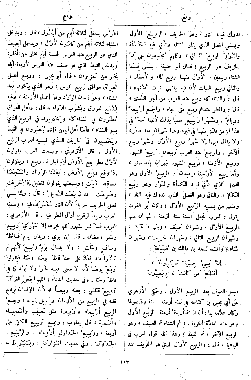 فَجَعَلَ الصَّيْفَ بَعْدَ الرَّبِيعِ الأَول. وَحَكَى الأَزهري عَنْ أَبي يَحْيَى بْنِ كُنَاسَةَ فِي صِفَةِ أَزمنة السَّنَةِ وفُصولها وَكَانَ علَّامة بِهَا: أَن السَّنَةَ أَربعةُ أَزمنة: الرَّبِيعُ الأَول وَهُوَ عِنْدَ الْعَامَّةِ الْخَرِيفُ، ثُمَّ الشِّتَاءُ ثُمَّ الصَّيْفُ، وَهُوَ الرَّبِيعُ الْآخِرُ، ثُمَّ الْقَيْظُ؛ وَهَذَا كُلُّهُ قَوْلُ الْعَرَبِ فِي الْبَادِيَةِ، قَالَ: وَالرَّبِيعُ الأَوّل الَّذِي هُوَ الْخَرِيفُ عِنْدَ الفُرْس يَدْخُلُ لِثَلَاثَةِ أَيام مِنْ أَيْلُول، قَالَ: وَيَدْخُلُ الشِّتَاءُ لِثَلَاثَةِ أَيام مِنْ كانُون الأَوّل، وَيَدْخُلُ الصَّيْفُ الَّذِي هُوَ الرَّبِيعُ عِنْدَ الْفُرْسِ لِخَمْسَةِ أَيام تَخْلُو مِنْ أَذار، وَيَدْخُلُ الْقَيْظُ الَّذِي هُوَ صَيْفٌ عِنْدَ الْفُرْسِ لأَربعة أَيام تَخْلُو مِنْ حَزِيران، قَالَ أَبو يَحْيَى: وَرَبِيعُ أَهل العِراق مُوَافِقٌ لِرَبِيعِ الْفُرْسِ، وَهُوَ الَّذِي يَكُونُ بَعْدَ الشِّتَاءِ، وَهُوَ زَمَانُ الوَرْد وَهُوَ أَعدل الأَزمنة، وَفِيهِ تُقْطع الْعُرُوقُ ويُشرب الدَّوَاءُ؛ قَالَ: وأَهل الْعِرَاقِ يُمطَرون فِي الشِّتَاءِ كُلِّهِ ويُخْصِبون فِي الرَّبِيعِ الَّذِي يَتْلُو الشِّتَاءَ، فأَما أَهل الْيَمَنِ فإِنهم يُمْطَرون فِي الْقَيْظِ ويُخْصِبون فِي الْخَرِيفِ الَّذِي تُسَمِّيهِ الْعَرَبُ الرَّبِيعَ الأَول. قَالَ الأَزهري: وَسَمِعْتُ الْعَرَبَ يَقُولُونَ لأَوّل مَطَرٍ يَقَعُ بالأَرض أَيام الْخَرِيفِ رَبِيعٌ، وَيَقُولُونَ إِذا وَقَعَ رَبِيعٌ بالأَرض: بَعَثْنا الرُّوّاد وانْتَجَعْنا مساقِط الغَيْثِ؛ وَسَمِعْتُهُمْ يَقُولُونَ لِلنَّخِيلِ إِذا خُرِفت وصُرِمَت: قَدْ تَربَّعَت النَّخِيلُ، قَالَ: وإِنما سُمِّيَ فَصْلُ الْخَرِيفِ خَرِيفًا لأَن الثِّمَارَ تُخْتَرَف فِيهِ، وَسَمَّتْهُ الْعَرَبُ رَبِيعًا لِوُقُوعِ أَوّل الْمَطَرِ فِيهِ. قَالَ الأَزهري: الْعَرَبُ تَذْكُر الشُّهُورَ كُلَّهَا مُجَرَّدَةً إِلا شَهْرَيْ رَبِيع وَشَهْرَ رَمَضَانَ. قَالَ ابْنُ بَرِّيٍّ: وَيُقَالُ يومٌ قائظٌ وصافٍ وشاتٍ، وَلَا يُقَالُ يومٌ رابِعٌ لأَنهم لَمْ يَبْنُوا مِنْهُ فِعْلًا عَلَى حَدِّ قاظَ يومُنا وَشَتَا فَيَقُولُوا رَبَعَ يومُنا لأَنه لَا مَعْنَى فِيهِ لحَرّ وَلَا بَرْد كَمَا فِي قاظَ وَشَتَا. وَفِي حَدِيثِ الدُّعَاءِ: