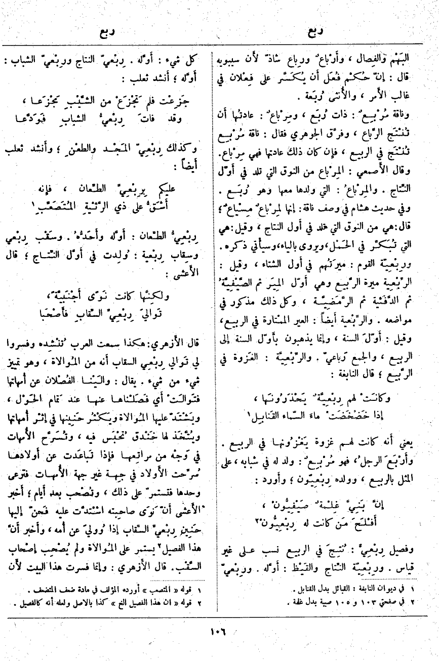 ؛ قَالَ: هِيَ مِنَ النُّوقِ الَّتِي تَلِدُ فِي أَول النِّتَاجِ، وَقِيلَ: هِيَ الَّتِي تُبَكِّر فِي الحَمْل، وَيُرْوَى بِالْيَاءِ، وسيأْتي ذِكْرُهُ. ورِبْعِيّة الْقَوْمِ: ميرَتُهم فِي أَول الشِّتَاءِ، وَقِيلَ: الرِّبْعِية مِيرَةُ الرَّبيع وَهِيَ أَوَّل المِيَر ثُمَّ الصَّيْفِيَّةُ ثُمَّ الدَّفَئية ثُمَّ الرَّمَضِيَّة، وَكُلُّ ذَلِكَ مَذْكُورٌ فِي مَوَاضِعِهِ. والرِّبْعية أَيضاً: الْعِيرُ الممْتارة فِي الرَّبِيعِ، وَقِيلَ: أَوّلَ السَّنَةِ، وإِنما يَذْهَبُونَ بأَوّل السَّنَةِ إِلى الرَّبِيعِ، وَالْجَمْعُ رَباعيّ. والرِّبْعِيَّة: الغَزوة فِي الرَّبيع؛ قَالَ النَّابِغَةُ: