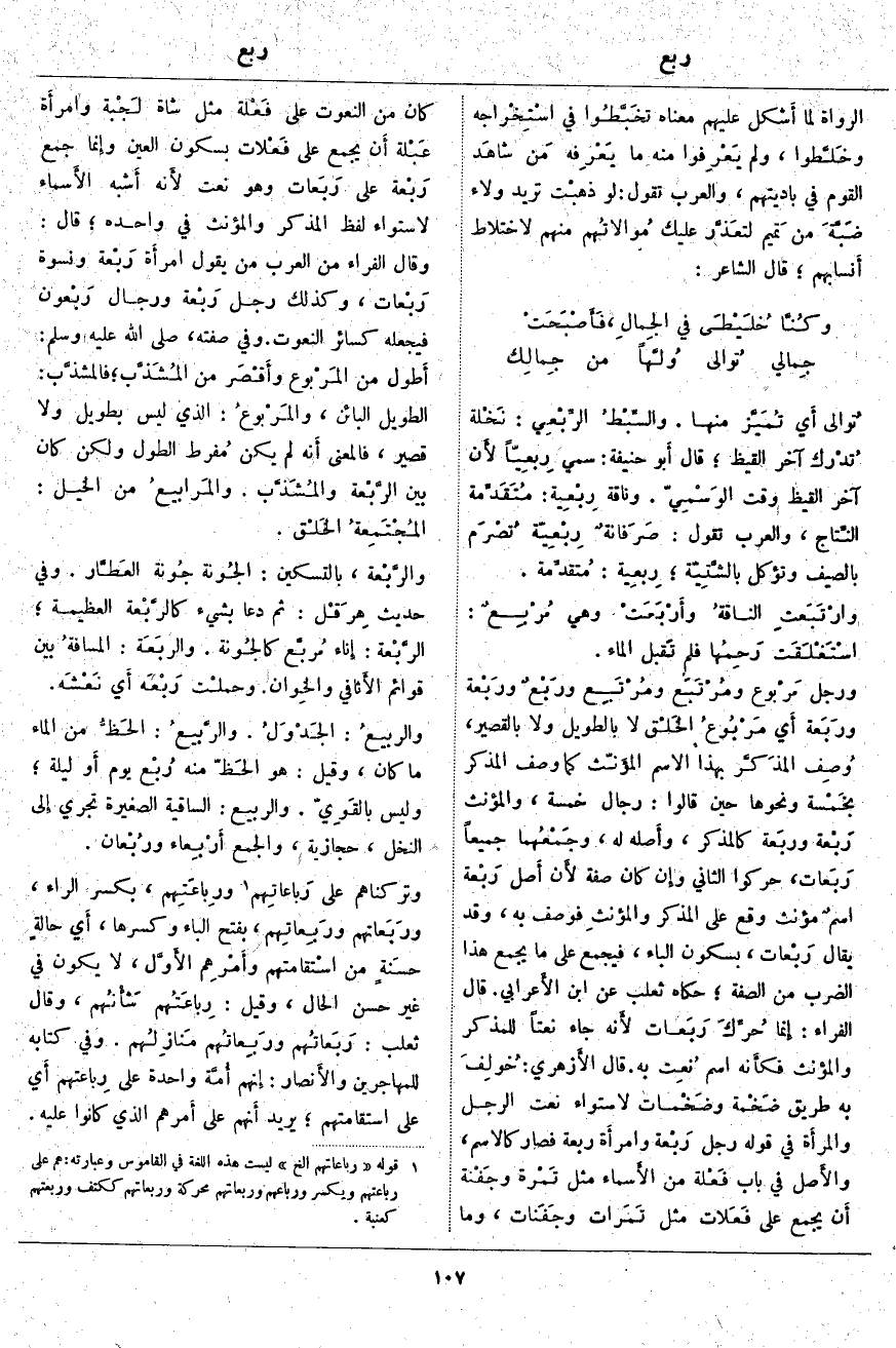 ؛ فالمشذَّب: الطَّوِيلُ الْبَائِنُ، والمَرْبوعُ: الَّذِي لَيْسَ بِطَوِيلٍ وَلَا قَصِيرٍ، فَالْمَعْنَى أَنه لَمْ يَكُنْ مُفرط الطُّولِ وَلَكِنْ كَانَ بَيْنَ الرَّبْعة والمُشَذَّب. والمَرابيعُ مِنَ الْخَيْلِ: المُجْتَمِعةُ الخَلْق. والرَّبْعة، بِالتَّسْكِينِ: الجُونة جُونة العَطَّار. وَفِي حَدِيثِ