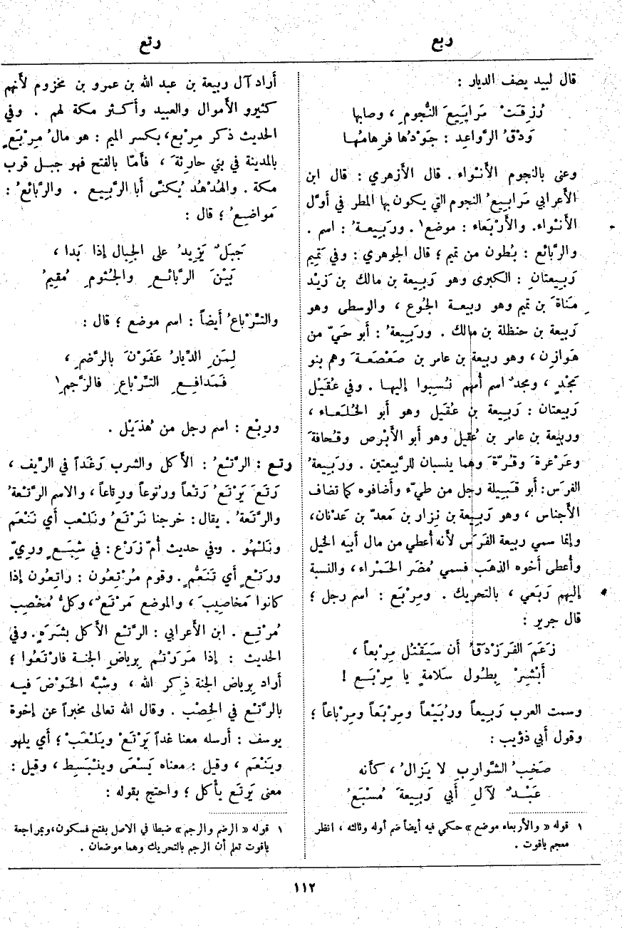 وَعَنَى بِالنُّجُومِ الأَنْواء. قَالَ الأَزهري: قَالَ ابْنُ الأَعرابي مَرابِيعُ النُّجُومِ الَّتِي يَكُونُ بِهَا الْمَطَرُ فِي أَوَّل الأَنْواء. والأَرْبَعاء: مَوْضِعٌ «1» ورَبِيعةُ: اسْمٌ. والرَّبائع: بُطون مِنْ تَمِيمٍ؛ قَالَ الْجَوْهَرِيُّ: وَفِي تَميم رَبِيعتانِ: الْكُبْرَى وَهُوَ رَبِيعة بْنُ مَالِكِ بْنِ زَيْد مَناةَ بْنِ تَمِيمٍ وَهُوَ رَبِيعَةُ الجُوع، وَالْوُسْطَى وَهُوَ رَبيعة بْنِ حَنْظَلَةَ بْنِ مَالِكِ. ورَبِيعةُ: أَبو حَيّ مِنْ هَوازِن، وَهُوَ رَبِيعَةَ بْنِ عَامِرِ بْنِ صَعْصَعةَ وَهُمْ بَنُو مَجْدٍ، ومجدٌ اسْمُ أُمهم نُسِبوا إِليها. وَفِي عُقَيْل رَبيعتان: رَبِيعة بن عُقَيل وهو أَبو الخُلَعاء، وَرَبِيعَةُ بْنُ عَامِرِ بن عُقيل وهو أَبو الأَبْرص وقُحافةَ وعَرْعرةَ وقُرّةَ وَهُمَا يُنْسَبَانِ للرَّبيعتين. ورَبِيعةُ الفرَس: أَبو قَبِيلة رَجُلٌ من طيّء وأَضافوه كَمَا تُضَافُ الأَجناس، وَهُوَ رَبِيعة بْنِ نِزار بْنِ مَعدّ بْنِ عَدْنان، وإِنما سُمِّيَ رَبِيعَةَ الفَرَس لأَنه أُعطي مِنْ مَالِ أَبيه الْخَيْلَ وأُعطي أَخوه الذهَب فَسُمِّيَ مُضَر الحَمْراء، وَالنِّسْبَةُ إِليهم رَبَعي، بِالتَّحْرِيكِ. ومِرْبَع: اسْمُ رَجُلٍ؛ قَالَ جَرِيرٌ: