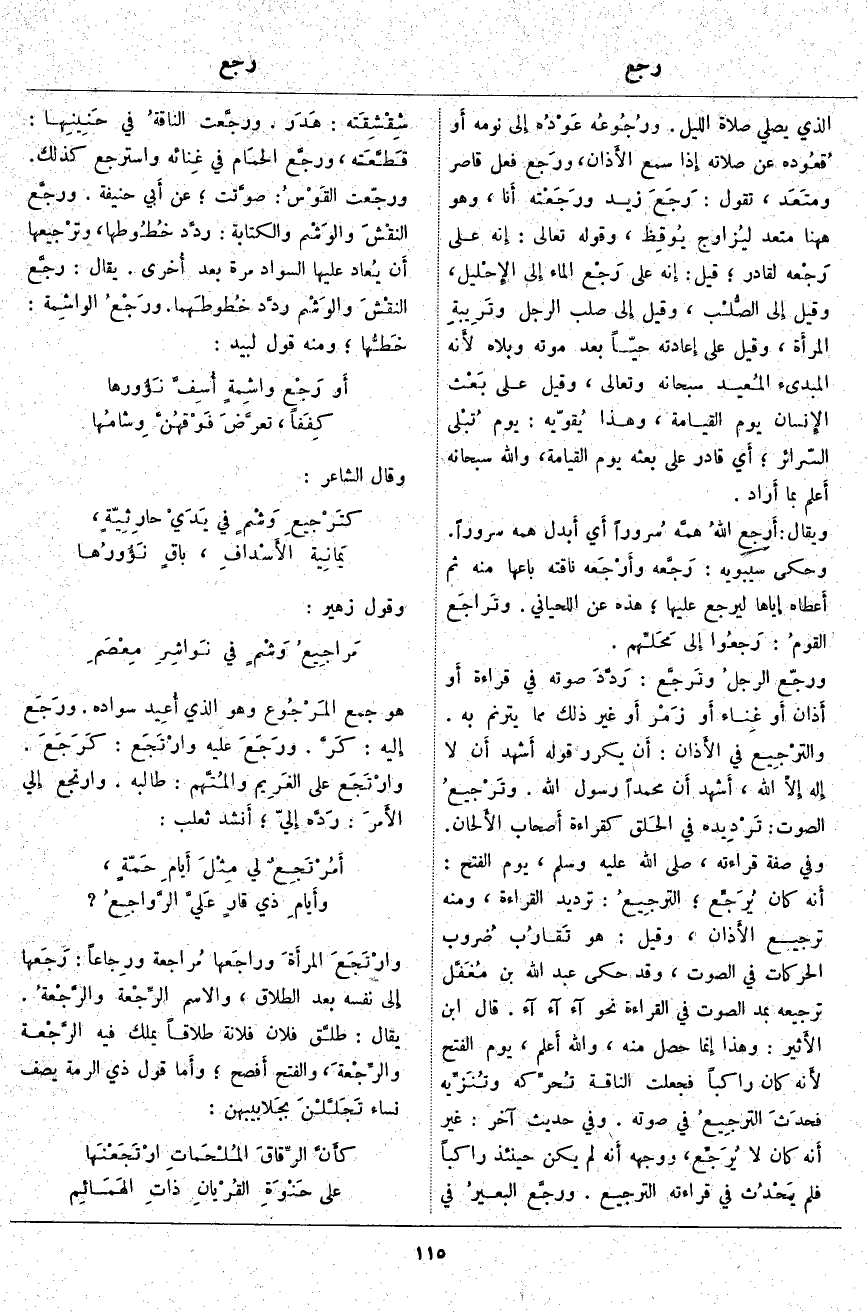 هُوَ جَمْعُ المَرْجُوع وَهُوَ الَّذِي أُعِيد سَوَادُهُ. ورَجَع إِليه: كَرَّ. ورَجَعَ عَلَيْهِ وارْتَجَع: كرَجَعَ. وارْتَجَع عَلَى الغَرِيم والمُتَّهم: طَالَبَهُ. وَارْتَجَعَ إِلي الأَمرَ: رَدَّه إِليّ؛ أَنشد ثَعْلَبٌ: