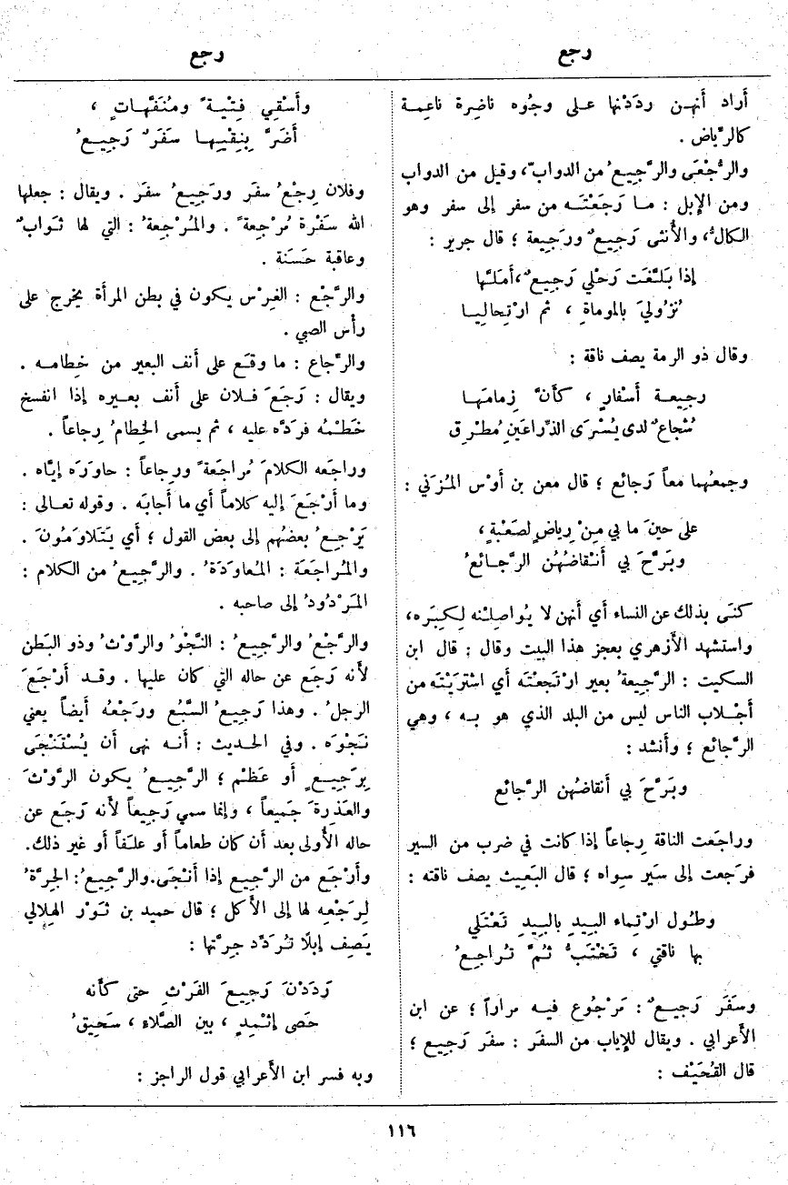 وسَفَر رَجيعٌ: مَرْجُوع فِيهِ مِرَارًا؛ عَنِ ابْنِ الأَعرابي. وَيُقَالُ للإِياب من السفَر: سفَر رَجِيع؛ قَالَ القُحَيْف: