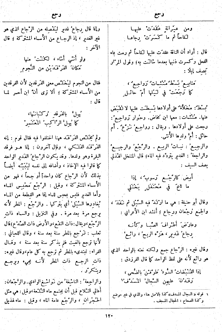 وَلَمْ يُخَلِّص الفَرْقَد هَاهُنَا اخْتَلَفُوا فِيهِ فَقَالَ قَوْمٌ: إِنه الفَرْقَد الفَلَكي، وَقَالَ آخَرُونَ: إِنما هُوَ فَرْقَدُ الْبَقَرَةِ وَهُوَ وَلَدُهَا. وَقَدْ يَكُونُ الرِّجاعُ الغَدير الْوَاحِدُ كَمَا قَالُوا فِيهِ الإِخاذ، وأَضافه إِلى نَفْسِهِ ليُبَيِّنه أَيضاً بِذَلِكَ لأَن الرِّجاع كَانَ وَاحِدًا أَو جَمْعًا، فَهُوَ مِنَ الأَسماء الْمُشْتَرَكَةِ، وَقِيلَ: الرَّجْع مَحْبِس الْمَاءِ وأَما الْغَدِيرُ فَلَيْسَ بِمِحْبَسٍ لِلْمَاءِ إِنما هُوَ القِطعة مِنَ الْمَاءِ يُغادِرها السَّيْلُ أَي يَتْرُكُهَا. والرَّجْع: الْمَطَرُ لأَنه يَرْجِعُ مَرَّةً بَعْدَ مَرَّةٍ. وَفِي التَّنْزِيلِ: وَالسَّماءِ ذاتِ الرَّجْعِ