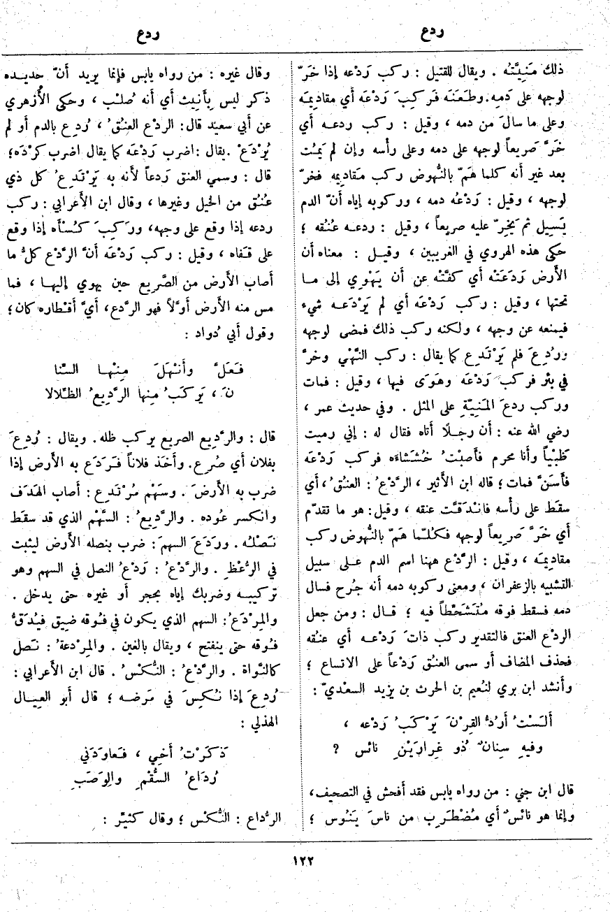 ؛ قَالَهُ ابْنُ الأَثير، الرَّدْعُ: العنُقُ، أَي سقَط عَلَى رأْسه فانْدَقَّت عُنُقُهُ، وَقِيلَ: هُوَ مَا تَقَدَّمَ أَي خَرَّ صَرِيعاً لِوَجْهِهِ فكُلّما هَمّ بالنُّهوض رَكِبَ مقادِيمَه، وَقِيلَ: الرَّدْع هَاهُنَا اسْمُ الدَّمِ عَلَى سَبِيلِ التَّشْبِيهِ بِالزَّعْفَرَانِ، وَمَعْنَى رُكُوبِهِ دَمَهُ أَنه جُرح فَسَالَ دَمُهُ فَسَقَطَ فَوْقَهُ مُتَشَحِّطاً فِيهِ؛ قَالَ: وَمَنْ جَعَلَ الردْع الْعُنُقَ فَالتَّقْدِيرُ رَكِبَ ذاتَ رَدْعه أَي عنُقه فَحَذَفَ الْمُضَافَ أَو سَمَّى العنُق رَدْعاً عَلَى الْإِتْسَاعِ؛ وأَنشد ابْنُ بَرِّيٍّ لنُعيم بْنِ الحرث بْنِ يَزِيدَ السعْديّ: