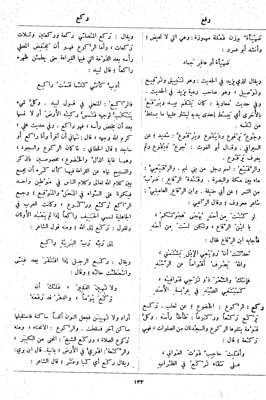 ركع: الرُّكوع: الخُضوع؛ عَنْ ثَعْلَبٍ. رَكع يَرْكَع رَكْعاً ورُكُوعاً: طَأْطأَ رأْسَه. وكلُّ قَوْمة يَتْلُوهَا الرُّكُوعُ والسجْدتان مِنَ الصَّلَوَاتِ، فهِي رَكْعة؛ قَالَ: