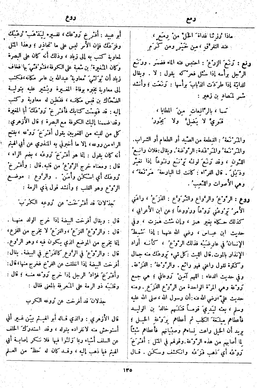 روع: الرَّوْعُ والرُّواع والتَّرَوُّع: الفَزَعُ، راعَني الأَمرُ يَرُوعُني رَوْعاً ورُووعاً؛ عَنِ ابْنِ الأَعرابي، كَذَلِكَ حَكَاهُ بِغَيْرِ هَمْزٍ، وإِن شِئْتَ هَمَزْتَ، وَفِي حَدِيثِ