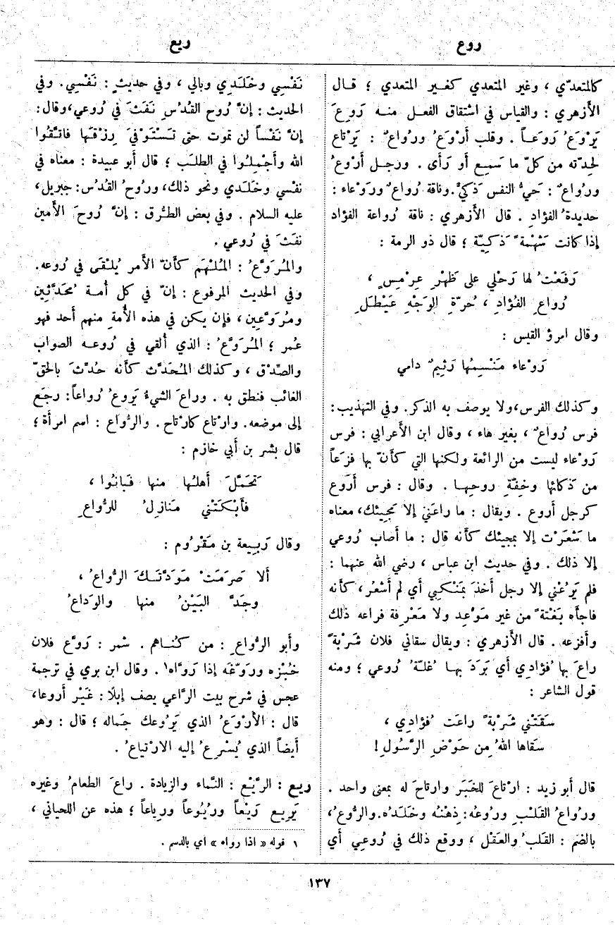 وأَبو الرُّواعِ: مِنْ كُناهم. شَمِرٌ: رَوَّع فُلَانٌ خُبْزه ورَوَّغَه إِذا رَوَّاه «3». وَقَالَ ابْنُ بَرِّيٍّ فِي تَرْجَمَةِ عَجَسَ فِي شَرْحِ بَيْتِ الرَّاعي يَصِفُ إِبلًا: غَيْر أَروعا، قَالَ: الأَرْوَعُ الَّذِي يَرُوعك جَماله؛ قَالَ: وَهُوَ أَيضاً الَّذِي يُسْرِعُ إِليه الارْتياعُ.
