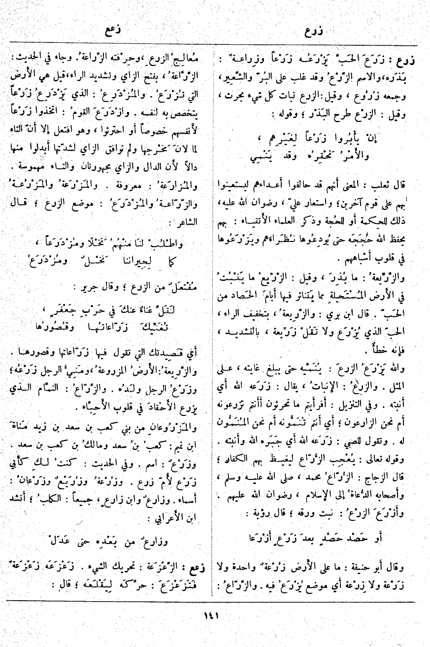 أَي قَصِيدتك الَّتِي تَقُولُ فِيهَا زَرّاعاتها وَقُصُورُهَا. والزَّرِيعةُ: الأَرضُ المزروعةُ، ومَنِيُّ الرَّجُلِ زَرْعُه؛ وزَرْعُ الرَّجُلِ ولَدُه. والزَّرّاعُ: النمَّام الَّذِي يَزْرَعُ الأَحْقادَ فِي قُلُوبِ الأَحِبَّاء. والمَزْرُوعانِ مِنْ بَنِي كَعْبِ بْنِ سَعْدِ بْنِ زَيْدِ مَناةَ بْنِ تَمِيمٍ: كعبُ بنُ سَعْدٍ ومالكُ بْنُ كَعْبِ بْنِ سَعْدِ. وزَرْعٌ: اسْمٌ. وَفِي الْحَدِيثِ: