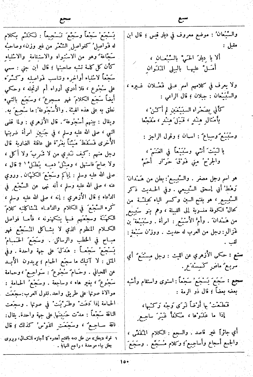 أَي جَائِرًا غَيْرَ قَاصِدٍ. وَالسَّجْعُ: الْكَلَامُ المُقَفَّى، وَالْجَمْعُ أَسجاع وأَساجِيعُ؛ وَكَلَامٌ مُسَجَّع. وسَجَعَ يَسْجَعُ سَجْعاً وسَجَّعَ تَسْجِيعاً: تَكَلَّم بِكَلَامٍ لَهُ فَواصِلُ كفواصِلِ الشِّعْر مِنْ غَيْرِ وَزْنٍ، وصاحبُه سَجّاعةٌ وَهُوَ مِنَ الاسْتِواءِ والاستقامةِ والاشتباهِ كأَن كُلَّ كَلِمَةٍ تُشْبِهُ صَاحِبَتَهَا؛ قَالَ ابْنُ جِنِّي: سُمِّيَ سَجْعاً لِاشْتِبَاهِ أَواخِره وَتَنَاسُبِ فَواصِلِه وكسَّرَه عَلَى سُجُوع، فَلَا أَدري أَرواه أَم ارْتَجَلَهُ، وحكِي أَيضاً سَجَع الكلامَ فَهُوَ مسجوعٌ، وسَجَع بِالشَّيْءِ نَطَقَ بِهِ عَلَى هَذِهِ الْهَيْئَةِ. والأُسْجُوعةُ: مَا سُجِعَ بِهِ. وَيُقَالُ: بَيْنَهُمْ أُسْجُوعةٌ. قَالَ الأَزهري: وَلَمَّا قَضَى النَّبِيُّ، صَلَّى اللَّهُ عَلَيْهِ وَسَلَّمَ، فِي جَنِينِ امرأَة ضَرَبَتْهَا الأُخرى فَسَقَطَ مَيِّتاً بغُرّة على عاقلة الضاربة قال رَجُلٌ مِنْهُمْ: كَيْفَ نَدِي مَنْ لَا شَرِبَ وَلَا أَكل، وَلَا صاحَ فَاسْتَهَلَّ، ومِثْلُ دمِه يُطَلْ «2»؟ قَالَ، صَلَّى اللَّهُ عَلَيْهِ وَسَلَّمَ: