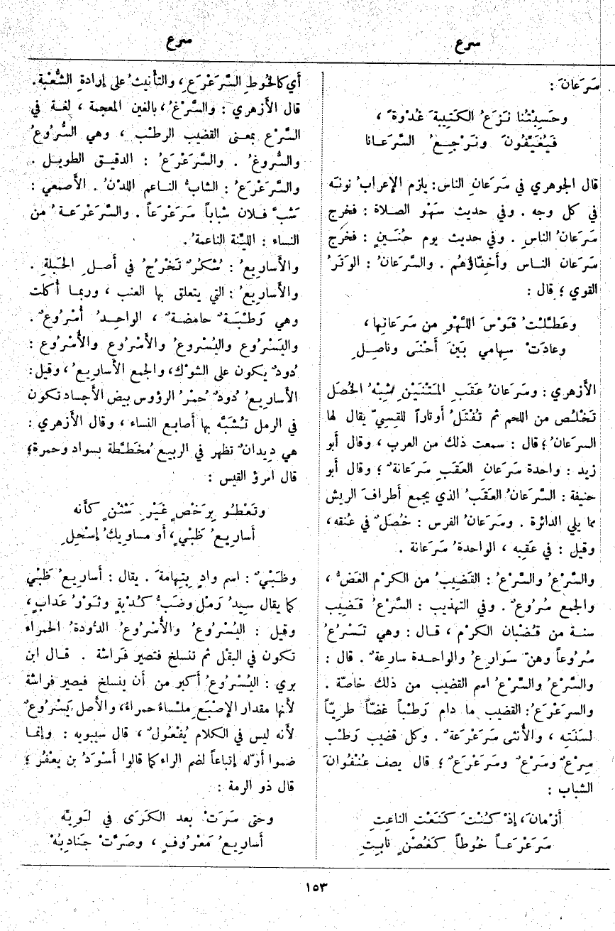أَي كالخُوطِ السَّرَعْرَعِ، والتأْنيثُ عَلَى إِرادةِ الشُّعْبة. قَالَ الأَزهري: والسَّرْغُ، بِالْغَيْنِ الْمُعْجَمَةِ، لُغَةٌ فِي السَّرْع بِمَعْنَى الْقَضِيبِ الرطْب، وَهِيَ السُّرُوعُ والسُّروغُ. والسَّرَعْرَعُ: الدَّقِيقُ الطَّوِيلُ. والسَّرَعْرَعُ: الشابُّ النَّاعِمُ اللدْنُ. الأَصمعي: شَبَّ فُلَانٌ شَبَابًا سَرَعْرَعاً. والسَّرَعْرَعةُ مِنَ النِّسَاءِ: الليِّنة الناعمةُ. والأَسارِيعُ: شُكُرٌ تَخْرُجُ فِي أَصلِ الحَبلةِ. والأَسارِيعُ: الَّتِي يَتَعَلَّقُ بِهَا الْعِنَبُ، وَرُبَّمَا أُكلت وَهِيَ رَطْبَةٌ حامضةٌ. الواحِدُ أُسْرُوعٌ. واليَسْرُوع واليُسْروعُ والأَسْرُوع الأُسْرُوع: دُودٌ يَكُونُ عَلَى الشوْك، وَالْجَمْعُ الأَسارِيعُ، وَقِيلَ: الأَسارِيعُ دُودٌ حُمْرُ الرؤوس بَيْضُ الأَجساد تَكُونُ فِي الرَّمْلِ تُشَبَّه بِهَا أَصابع النِّسَاءِ، وَقَالَ الأَزهري: هِيَ دِيدانٌ تَظْهَرُ فِي الرَّبِيعِ مُخَطَّطة بِسَوَادٍ وَحُمْرَةٍ؛ قَالَ امْرُؤُ الْقَيْسِ: