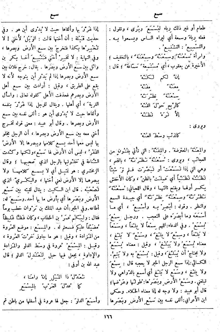 ، أَي مَا أَسْمَعَه وَمَا أَبصَرَه عَلَى التَّعَجُّبِ. وَرَجُلٌ سِمْعٌ يُسْمَعُ. وَفِي الدُّعَاءِ: اللَّهُمَّ سِمْعاً لَا بِلْغاً، وسَمْعاً لَا بَلْغاً، وسِمْعٌ لَا بِلْغٌ، وسَمْعٌ لَا بَلْغ، مَعْنَاهُ يُسْمَعُ وَلَا يَبْلُغُ، وَقِيلَ: مَعْنَاهُ يُسْمَعُ وَلَا يحتاجُ أَن يُبَلَّغَ، وَقِيلَ: يُسْمَعُ بِهِ وَلَا يَتِمُّ. الْكِسَائِيُّ: إِذا سَمِعَ الرَّجُلُ الْخَبَرَ لَا يُعْجِبُهُ قَالَ: سِمْعٌ وَلَا بِلْغ، وسَمْع لَا بَلْغ أَي أَسمع بِالدَّوَاهِي وَلَا تَبْلُغْنِي. وسَمْعُ الأَرضِ وبَصَرُها: طُولُها وعَرْضها؛ قَالَ أَبو عُبَيْدٍ: وَلَا وَجْهَ لَهُ إِنما مَعْنَاهُ الخَلاء. وَحَكَى ابْنُ الأَعرابي: أَلقى نَفْسَهُ بَيْنَ سَمْعِ الأَرضِ وبَصَرِها إِذا غَرَّرَ بِهَا وأَلقاها حَيْثُ لَا يُدْرى أَين هُوَ. وَفِي حَدِيثِ