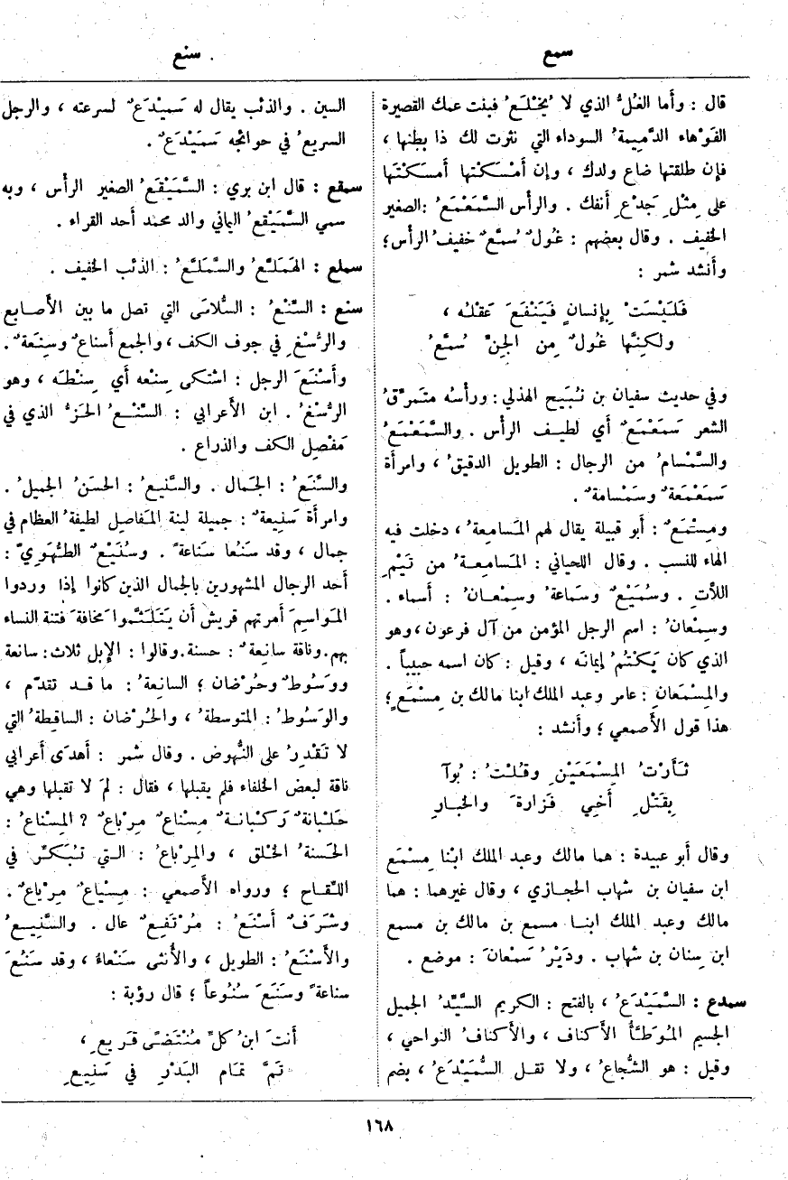 سنع: السِّنْعُ: السُّلامَى الَّتِي تَصِلُ مَا بَيْنَ الأَصابع والرُّسْغِ فِي جَوْفِ الْكَفِّ، وَالْجُمَعُ أَسناعٌ وسِنَعةٌ. وأَسْنَعَ الرَّجُلُ: اشْتَكَى سِنْعه أَي سِنْطَه، وَهُوَ الرُّسْغُ. ابْنُ الأَعرابي: السِّنْعُ الحَزُّ الَّذِي فِي مَفْصِل الْكَفِّ وَالذِّرَاعِ. والسَّنَعُ: الجَمال. والسَّنيعُ: الحسَنُ الجميلُ. وامرأَة سَنِيعةٌ: جَمِيلَةٌ لَيِّنَةُ المَفاصِل لطيفةُ الْعِظَامِ فِي جَمَالٍ، وَقَدْ سَنُعا سَناعةً. وسُنَيْعٌ الطُّهَوِيّ: أَحد الرِّجَالِ الْمَشْهُورِينَ بِالْجَمَالِ الَّذِينَ كَانُوا إِذا وَرَدُوا المَواسِمَ أَمرتهم قُرَيْشٌ أَن يَتَلَثَّموا مَخافةَ فِتْنَةِ النِّسَاءِ بِهِمْ. وَنَاقَةٌ سانِعةٌ: حَسَنَةٌ. وَقَالُوا: الإِبل ثَلَاثٌ: سانعة ووَسُوطٌ وحُرْضان؛ السانِعةُ: مَا قَدْ تَقَدَّمَ، والوَسُوطُ: المتوسطةُ، والحُرْضان: الساقِطةُ الَّتِي لَا تَقْدِرُ عَلَى النُّهوض. وقال شَمِرٌ: أَهدَى أَعرابي نَاقَةً لِبَعْضِ الْخُلَفَاءِ فَلَمْ يَقْبَلْهَا، فَقَالَ: لمَ لَا تَقْبَلُهَا وَهِيَ حَلْبانةٌ رَكْبانةٌ مِسْناعٌ مِرْباعٌ؟ المِسْناعُ: الحَسنةُ الخلْق، والمِرْباعُ: الَّتِي تُبَكِّر فِي اللِّقاح؛ وَرَوَاهُ الأَصمعي: مِسْياعٌ مِرْياعٌ. وشَرَفٌ أَسْنَعُ: مُرْتَفِعٌ عَالٍ. والسَّنِيعُ والأَسْنَعُ: الطَّوِيلُ، والأُنثى سَنْعاءُ، وَقَدْ سَنُعَ سَنَاعَةً وسَنَعَ سُنُوعاً؛ قَالَ رُؤْبَةُ:
