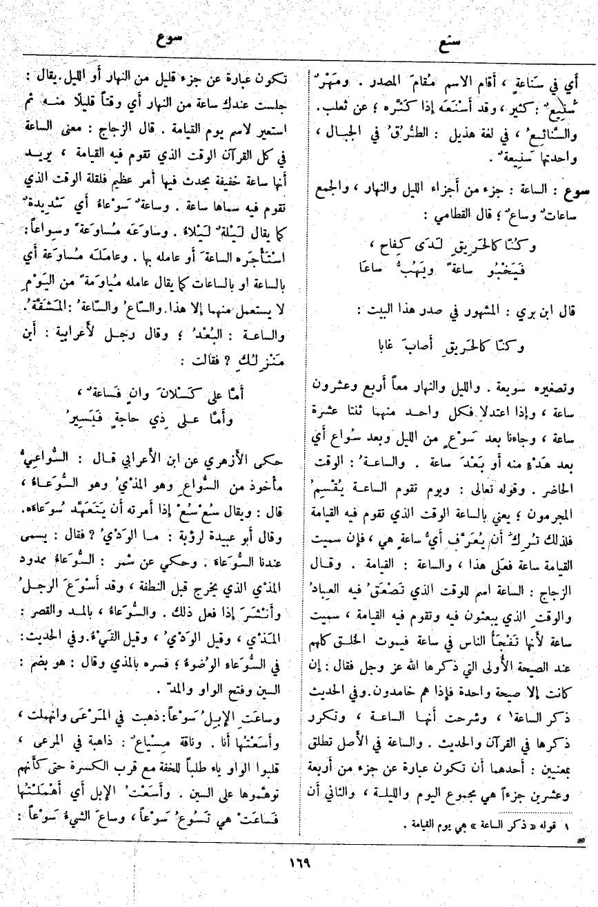 ؛ يَعْنِي بِالسَّاعَةِ الْوَقْتَ الَّذِي تَقُومُ فِيهِ الْقِيَامَةُ فَلِذَلِكَ تُرِكَ أَن يُعَرَّف أَيُّ ساعةٍ هِيَ، فإِن سُمِّيَتِ الْقِيَامَةُ سَاعَةً فعَلى هَذَا، وَالسَّاعَةُ: الْقِيَامَةُ. وَقَالَ الزَّجَّاجُ: السَّاعَةُ اسْمٌ لِلْوَقْتِ الَّذِي تَصْعَقُ فِيهِ العِبادُ والوقتِ الَّذِي يُبْعَثُونَ فِيهِ وَتَقُومُ فِيهِ الْقِيَامَةُ، سُمِّيَتِ سَاعَةً لأَنها تَفْجَأُ النَّاسَ فِي سَاعَةٍ فَيَمُوتُ الْخُلُقُ كُلُّهُمْ عِنْدَ الصَّيْحَةِ الأُولى الَّتِي ذَكَرَهَا اللَّهِ عَزَّ وَجَلَّ فَقَالَ: إِنْ كانَتْ إِلَّا صَيْحَةً واحِدَةً فَإِذا هُمْ خامِدُونَ. وَفِي الْحَدِيثِ ذِكْرُ السَّاعَةِ «2»، وَشُرِحَتْ أَنها السَّاعَةُ، وَتَكَرَّرَ ذِكْرُهَا فِي الْقُرْآنِ وَالْحَدِيثِ. وَالسَّاعَةُ فِي الأَصل تُطْلَقُ بِمَعْنَيَيْنِ: أَحدهما أَن تَكُونَ عِبَارَةً عَنْ جُزْءٌ مِنْ أَربعة وَعِشْرِينَ جُزْءًا هِيَ مَجْمُوعُ الْيَوْمِ وَاللَّيْلَةِ، وَالثَّانِي أَن تَكُونَ عِبَارَةً عَنْ جُزْءٍ قَلِيلٍ مِنَ النَّهَارِ أَو اللَّيْلِ. يُقَالُ: جَلَسْتُ عِنْدَكَ سَاعَةً مِنَ النَّهَارِ أَي وَقْتًا قَلِيلًا مِنْهُ ثُمَّ اسْتُعِيرَ لِاسْمِ يَوْمِ الْقِيَامَةِ. قَالَ الزَّجَّاجُ: مَعْنَى السَّاعَةِ فِي كُلِّ الْقُرْآنِ الْوَقْتُ الَّذِي تَقُومُ فِيهِ الْقِيَامَةُ، يُرِيدُ أَنها سَاعَةً خَفِيفَةً يَحْدُثُ فِيهَا أَمر عَظِيمٌ فَلِقِلَّةِ الْوَقْتِ الَّذِي تَقُومُ فِيهِ سَمَّاهَا سَاعَةً. وساعةٌ سوْعاءُ أَي شَدِيدةٌ كَمَا يُقَالُ لَيْلةٌ لَيْلاءُ. وساوَعَه مُساوَعةً وسِواعاً: استأْجَره الساعةَ أَو عَامَلَهُ بِهَا. وعامَلَه مُساوَعة أَي بِالسَّاعَةِ أَو بِالسَّاعَاتِ كَمَا يُقَالُ عَامَلَهُ مُياوَمةً مِنَ اليَوْمِ لَا يُسْتَعْمَلُ مِنْهُمَا إِلا هَذَا. والسّاعُ والسّاعةُ: المَشَقَّةُ. وَالسَّاعَةُ: البُعْدُ؛ وَقَالَ رَجُلٌ لأَعرابية: أَين مَنْزِلُكِ؟ فَقَالَتْ: