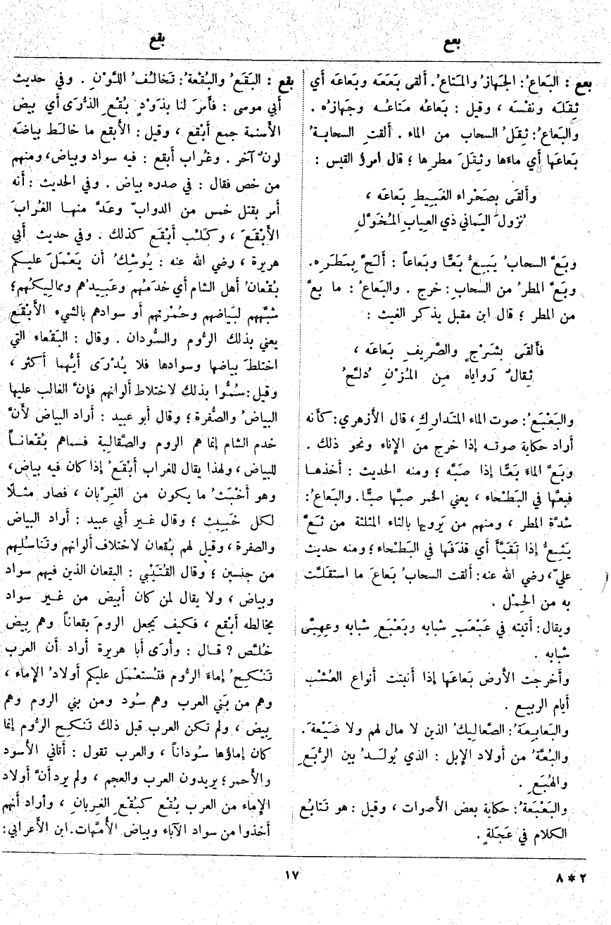 بعع: البَعاعُ: الجَهازُ والمَتاعُ. أَلقى بَعَعَه وبَعاعَه أَي ثِقَلَه ونفْسَه، وَقِيلَ: بَعاعُه مَتاعُه وجَهازُه. والبَعاعُ: ثِقَلُ السَّحَابِ مِنَ الْمَاءِ. أَلقتِ السحابةُ بَعاعَها أَي ماءَها وثِقَلَ مطرِها؛ قَالَ إمرؤُ الْقَيْسِ: