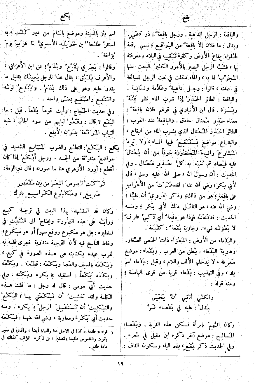 وَكَانَ قَدِ اسْتُشْهِدَ بِهَذَا الْبَيْتِ فِي تَرْجَمَةِ كَبَعَ ورأَيتُه عَلَى هَذِهِ الصُّورَة ويحتاجُ إِلى التَّثَبُّتِ فِي تَسْطِيرِهِ: هَلْ هُوَ مَكْبُوعٌ وَوَقَعَ سَهْوًا أَو هُوَ مَبْكُوعٌ، وَغَلِطَ النَّاسِخُ فِيهِ لأَن التَّرْجَمَةَ مُتَقَارِبَةٌ فَجَرَى قَلَمُهُ بِهِ لِقُرْبِ عَهْدِهِ بِكِتَابَتِهِ عَلَى هَذِهِ الصُّورَةِ فِي كَبَعَ، وبَكَعَه بِالسَّيْفِ والعَصا وبَكَّعَه: قطَّعَه. وبكَّعَه وبَكَعَه بَكْعاً: اسْتَقْبَلَهُ بِمَا يَكْرَهُ وبَكَّته. وَفِي حَدِيثِ