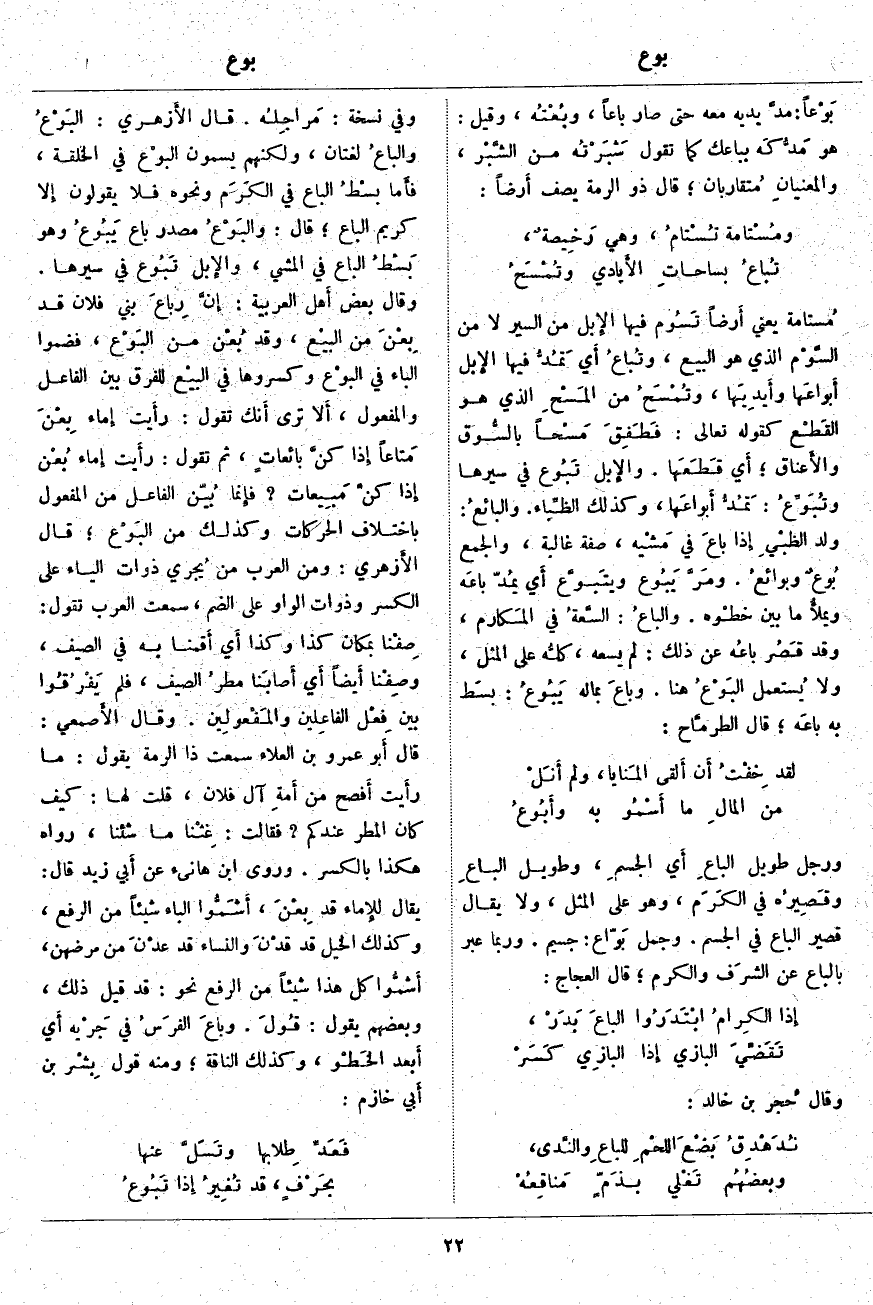 مَستامة يَعْنِي أَرضاً تَسُوم فِيهَا الإِبل مِنَ السَّيْرِ لَا مِنَ السَّوْم الَّذِي هُوَ الْبَيْعُ، وتُباعُ أَي تَمُدُّ فِيهَا الإِبل أَبواعَها وأَيدِيَها، وتُمْسَحُ مِنَ المَسْحِ الَّذِي هُوَ القَطْع كَقَوْلِهِ تَعَالَى: فَطَفِقَ مَسْحاً بِالسُّوقِ وَالْأَعْناقِ؛ أَي قَطَعَها. والإِبل تَبُوع فِي سَيْرِهَا وتُبَوِّعُ: تَمُدُّ أَبواعَها، وَكَذَلِكَ الظِّباء. والبائعُ: وَلَدُ الظبْيِ إِذا باعَ فِي مَشْيه، صِفَةٌ غَالِبَةٌ، وَالْجَمْعُ بُوعٌ وبوائعُ. ومَرَّ يَبُوع ويتَبوَّع أَي يمُدّ باعَه ويملأُ مَا بَيْنَ خطْوه. والباعُ: السَّعةُ فِي المَكارم، وَقَدْ قَصُر باعُه عَنْ ذَلِكَ: لَمْ يَسَعْهُ، كلُّه عَلَى الْمَثَلِ، وَلَا يُستعمل البَوْعُ هُنَا. وباعَ بِمَالِهِ يَبُوعُ: بسَط بِهِ باعَه؛ قَالَ الطرمَّاح:
