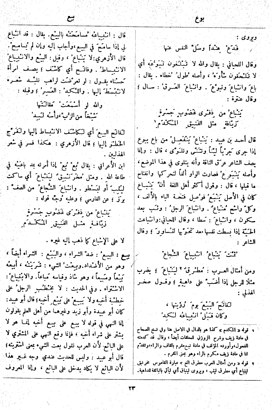 بيع: البيعُ: ضِدُّ الشِّرَاءِ، والبَيْع: الشِّرَاءُ أَيضاً، وَهُوَ مِنَ الأَضْداد. وبِعْتُ الشَّيْءَ: شَرَيْتُه، أَبيعُه بَيْعاً ومَبيعاً، وَهُوَ شَاذٌّ وَقِيَاسُهُ مَباعاً. والابْتِياعُ: الاشْتراء. وَفِي الْحَدِيثِ: