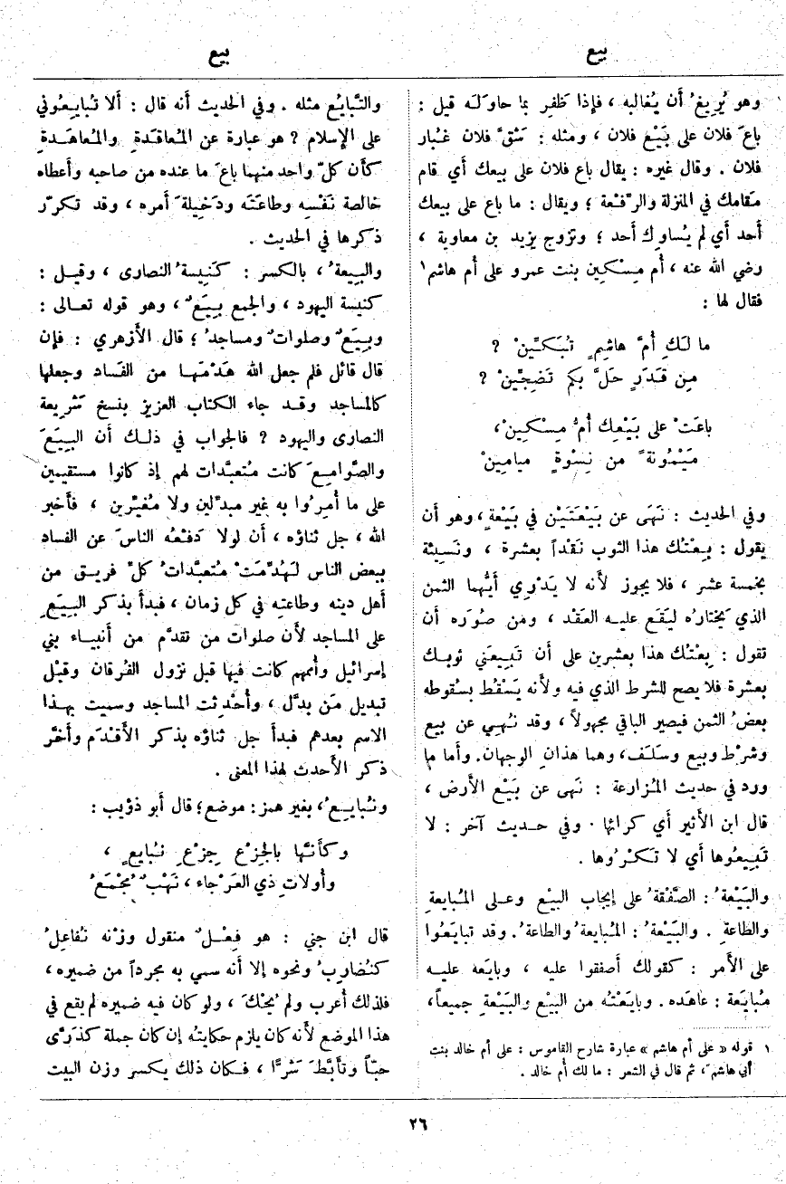 ؛ قَالَ الأَزهري: فإِن قَالَ قَائِلٌ فَلِمَ جَعَلَ اللَّهُ هَدْمَها مِنَ الفَساد وَجَعْلَهَا كَالْمَسَاجِدِ وَقَدْ جَاءَ الْكِتَابُ الْعَزِيزُ بِنَسْخِ شَرِيعة النَّصَارَى وَالْيَهُودِ؟ فَالْجَوَابُ فِي ذَلِكَ أَن البِيَعَ والصَّوامعَ كَانَتْ مُتعبَّدات لَهُمْ إِذ كَانُوا مُسْتَقِيمِينَ عَلَى مَا أُمِرُوا بِهِ غَيْرِ مبدِّلين وَلَا مُغيِّرين، فأَخبر اللَّهُ، جَلَّ ثَنَاؤُهُ، أَن لَوْلَا دَفْعُه الناسَ عَنِ الْفَسَادِ بِبَعْضِ النَّاسِ لَهُدِّمَتْ مُتعبَّداتُ كلِّ فَرِيقٍ مِنْ أَهل دِينِهِ وطاعتِه فِي كُلِّ زَمَانٍ، فبدأَ بِذِكْرِ البِيَعِ عَلَى الْمَسَاجِدِ لأَن صَلَوَاتِ مَنْ تقدَّم مِنْ أَنبياء بَنِي إِسرائيل وأُممهم كَانَتْ فِيهَا قَبْلَ نُزُولِ الفُرقان وقبْل تَبْدِيلِ مَن بدَّل، وأُحْدِثت الْمَسَاجِدُ وَسُمِّيَتْ بِهَذَا الِاسْمِ بَعْدَهُمْ فبدأَ جَلَّ ثَنَاؤُهُ بِذِكْرِ الأَقْدَم وأَخَّر ذِكْرَ الأَحدث لِهَذَا الْمَعْنَى. ونُبايِعُ، بِغَيْرِ هَمْزٍ: مَوْضِعٌ؛ قَالَ أَبو ذُؤَيْبٍ: