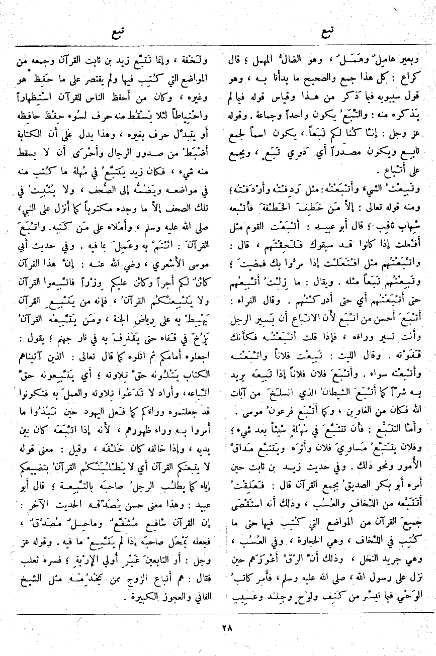 ، وَذَلِكَ أَنه اسْتَقْصَى جميعَ الْقُرْآنِ مِنَ الْمَوَاضِعِ الَّتِي كُتِب فِيهَا حَتَّى مَا كُتِب فِي اللِّخاف، وَهِيَ الْحِجَارَةُ، وَفِي العُسُب، وَهِيَ جَرِيدُ النَّخْلِ، وَذَلِكَ أَنَّ الرَّقَّ أَعْوَزَهم حِينَ نَزَلَ عَلَى رَسُولِ اللَّهِ، صَلَّى اللَّهُ عَلَيْهِ وَسَلَّمَ، فأُمِر كاتبُ الوَحْي فِيمَا تيسَّر مِنْ كَتِف ولوْحٍ وجِلْد وعَسِيب ولَخْفة، وإِنما تَتبَّع زَيْدُ بْنُ ثَابِتٍ الْقُرْآنَ وَجَمَعَهُ مِنَ الْمَوَاضِعِ الَّتِي كُتِب فِيهَا وَلَمْ يَقْتَصِرْ عَلَى مَا حَفِظ هُوَ وَغَيْرُهُ، وَكَانَ مِنْ أَحفظ النَّاسِ لِلْقُرْآنِ اسْتِظهاراً واحْتِياطاً لِئَلَّا يَسْقُط مِنْهُ حَرْفٌ لسُوء حِفْظ حافِظه أَو يتبدَّل حَرْفٌ بِغَيْرِهِ، وَهَذَا يَدُلُّ عَلَى أَن الْكِتَابَةَ أَضْبَطُ مِنْ صُدُورِ الرِّجَالِ وأَحْرَى أَن لَا يَسْقُطَ مِنْهُ شَيْءٌ، فَكَانَ زَيْدٌ يَتتبَّع فِي مُهلة مَا كُتب مِنْهُ فِي مَوَاضِعِهِ ويَضُمُّه إِلى الصُّحف، وَلَا يُثْبِتُ فِي تِلْكَ الصُّحُفِ إِلَّا مَا وَجَدَهُ مَكْتُوبًا كَمَا أُنزل عَلَى النَّبِيِّ، صَلَّى اللَّهُ عليه وَسَلَّمَ، وأَمْلاه عَلَى مَن كَتبه. واتَّبَعَ القرآنَ: ائْتَمَّ بِهِ وعَمِلَ بِمَا فِيهِ. وَفِي حَدِيثِ