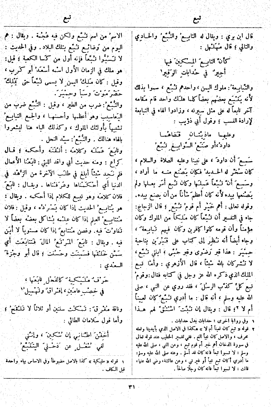 ؛ قِيلَ: هُوَ مَلِكٌ فِي الزَّمَانِ الأَول اسْمه أَسْعَدُ أَبو كَرِب، وَقِيلَ: كَانَ مَلِكُ اليمنِ لَا يُسَمَّى تُبَّعاً حَتَّى يَمْلِكَ حَضْرَمَوْتَ وسَبأ وحِمْيَرَ. والتُّبَّعُ: ضَرْبٌ مِنَ الطَّيْرِ، وَقِيلَ: التُّبَّع ضَرْبٌ مِنَ اليَعاسِيب وَهُوَ أَعظمها وَأَحْسَنُهَا، وَالْجَمْعُ التبابِعُ تَشْبِيهًا بأُولئك الْمُلُوكِ، وَكَذَلِكَ الْبَاءُ هُنَا لِيَشْعُرُوا بِالْهَاءِ هُنَالِكَ. والتُّبَّعُ: سيِّد النَّحْلِ: وتابَعَ عَمَلَه وكلامَه: أَتْقَنَه وأَحكمه؛ قَالَ كُرَاعٍ: وَمِنْهُ حَدِيثُ