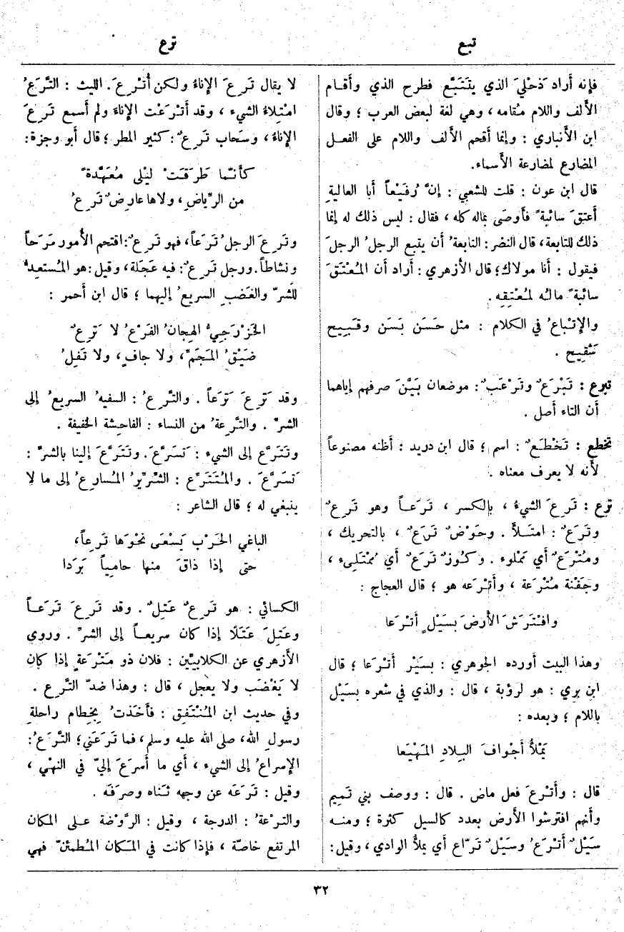فإِنه أَرادَ ذَحْليَ الَّذِي يتَتَبَّع فَطَرَحَ الَّذِي وأَقام الأَلف وَاللَّامَ مُقامه، وَهِيَ لُغَةٌ لِبَعْضِ الْعَرَبِ؛ وَقَالَ ابْنُ الأَنباري: وَإِنما أَقحم الأَلف وَاللَّامَ عَلَى الْفِعْلِ الْمُضَارِعِ لِمُضَارَعَةِ الأَسماء. قَالَ ابْنُ عَوْنٍ: قُلْتُ لِلشَّعْبِيِّ: إِنَّ رُفَيْعاً أَبا العاليةِ أَعتقَ سَائِبَةً فأَوصَى بِمَالِهِ كُلِّهِ، فَقَالَ: لَيْسَ ذَلِكَ لَهُ إِنما ذَلِكَ لِلتَّابِعَةِ، قَالَ النَّضِرُ: التابعةُ أَن يَتْبَعَ الرجلُ الرجلَ فَيَقُولُ: أَنا مَوْلَاكَ؛ قَالَ الأَزهري: أَراد أَن المُعْتَقَ سَائِبَةً مالُه لمُعْتِقِه. والإِتْباعُ فِي الْكَلَامِ: مِثْلُ حَسَن بَسَن وقَبِيح شَقِيح.