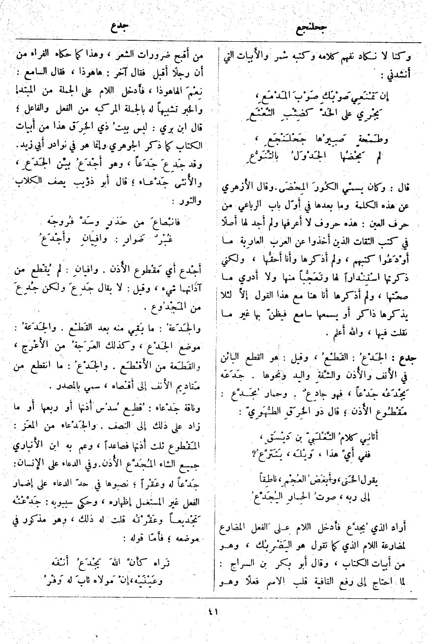 أجْدع أَي مَقْطوع الأُذن. وافيانِ: لَمْ يُقْطع مِنْ آذَانِهِمَا شَيْءٌ، وَقِيلَ: لَا يُقَالُ جَدِعَ وَلَكِنْ جُدِعَ مِنَ المَجْدُوع. والجَدَعةُ: مَا بَقِي مِنْهُ بَعْدَ القَطْع. والجَدَعةُ: مَوْضِعُ الجَدْع، وَكَذَلِكَ العَرَجةُ مِنَ الأَعْرج، والقَطَعة مِنَ الأَقْطَع. والجَدْعُ: مَا انْقَطَعَ مِنْ مَقادِيم الأَنف إِلى أَقْصاه، سُمِّيَ بِالْمَصْدَرِ. وَنَاقَةٌ جَدْعاء: قُطِع سُدسُ أُذنها أَو رُبُعُهَا أَو مَا زَادَ عَلَى ذَلِكَ إِلى النِّصْفِ. والجَدْعاء مِنَ المعَز: المَقْطوع ثُلُثُ أُذنها فَصَاعِدًا، وَعَمَّ بِهِ ابْنُ الأَنباري جَمِيعَ الشَّاءِ المُجَدَّع الأُذن. وَفِي الدُّعَاءِ عَلَى الإِنسان: جَدْعاً لَهُ وعَقْراً؛ نَصَبُوهَا فِي حَدِّ الدُّعَاءِ عَلَى إِضمار الْفِعْلِ غَيْرِ الْمُسْتَعْمَلِ إِظهاره، وَحَكَى سِيبَوَيْهِ: جَدَّعْتُه تَجْديعاً وعَقَّرْتُه قُلْتُ لَهُ ذَلِكَ، وَهُوَ مَذْكُورٌ فِي مَوْضِعِهِ؛ فأَمّا قَوْلُهُ: