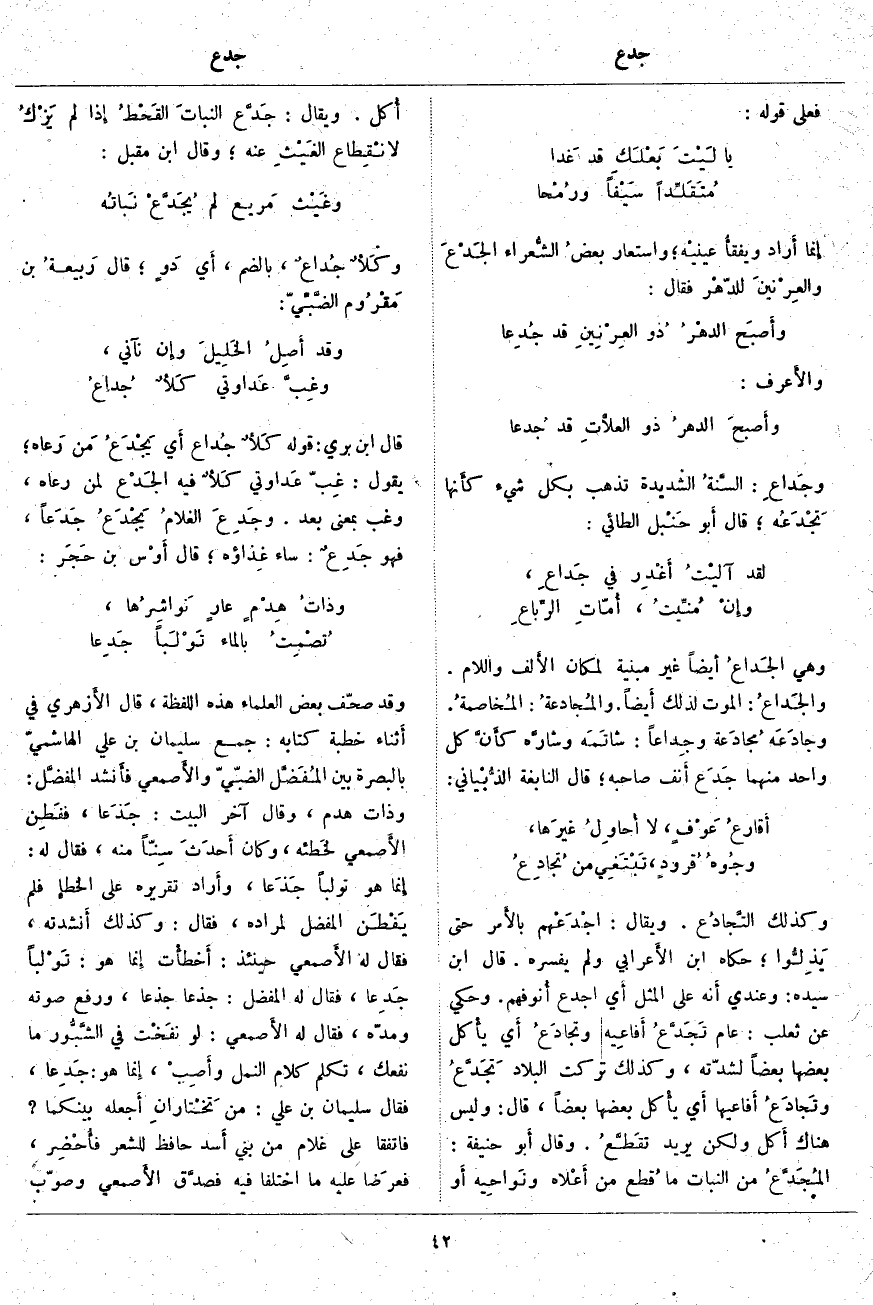 وكَلأٌ جُداعٌ، بِالضَّمِّ، أَي دَوٍ؛ قَالَ رَبيعةُ بْنُ مَقْرُوم الضَّبِّيّ: