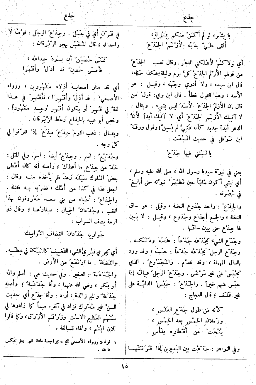 أَي قَدْ صَارَ أَصحابه أَذِلاء مَقْهُورِين، وَرَوَاهُ الأَصمعي «2» قَدْ أُذِلَّ وأُقْهِرَا، فأُقْهِرَا فِي هَذَا لغةٌ فِي قُهِرَ أَو يَكُونُ أُقْهِر وُجِد مَقْهُوراً. وَخَصَّ أَبو عُبَيْدٍ بالجِذاع رَهْط الزِّبْرقان. وَيُقَالُ: ذَهَبَ القومُ جِذَعَ مِذَعَ إِذا تفرَّقوا فِي كُلِّ وَجْهٍ. وجُذَيْعٌ: اسْمٌ. وجِذْعٌ أَيضاً: اسْمٌ. وَفِي الْمَثَلِ: خُذْ مِنْ جِذْعٍ مَا أَعطاكَ؛ وأَصله أَنه كَانَ أَعْطى بعضَ المُلوك سَيْفَه رَهناً فَلَمْ يأْخذه مِنْهُ وَقَالَ: اجْعَلْ هَذَا فِي كَذَا مِنْ أُمِّك، فضرَبه بِهِ فَقَتَلَهُ. والجِذاعُ: أَحْياء مِنْ بَنِي سَعْدٍ مَعْروفون بِهَذَا اللَّقَبِ. وجُذْعانُ الجِبال: صِغارُها؛ وَقَالَ ذُو الرُّمَّةِ يَصِفُ السَّرَابَ: