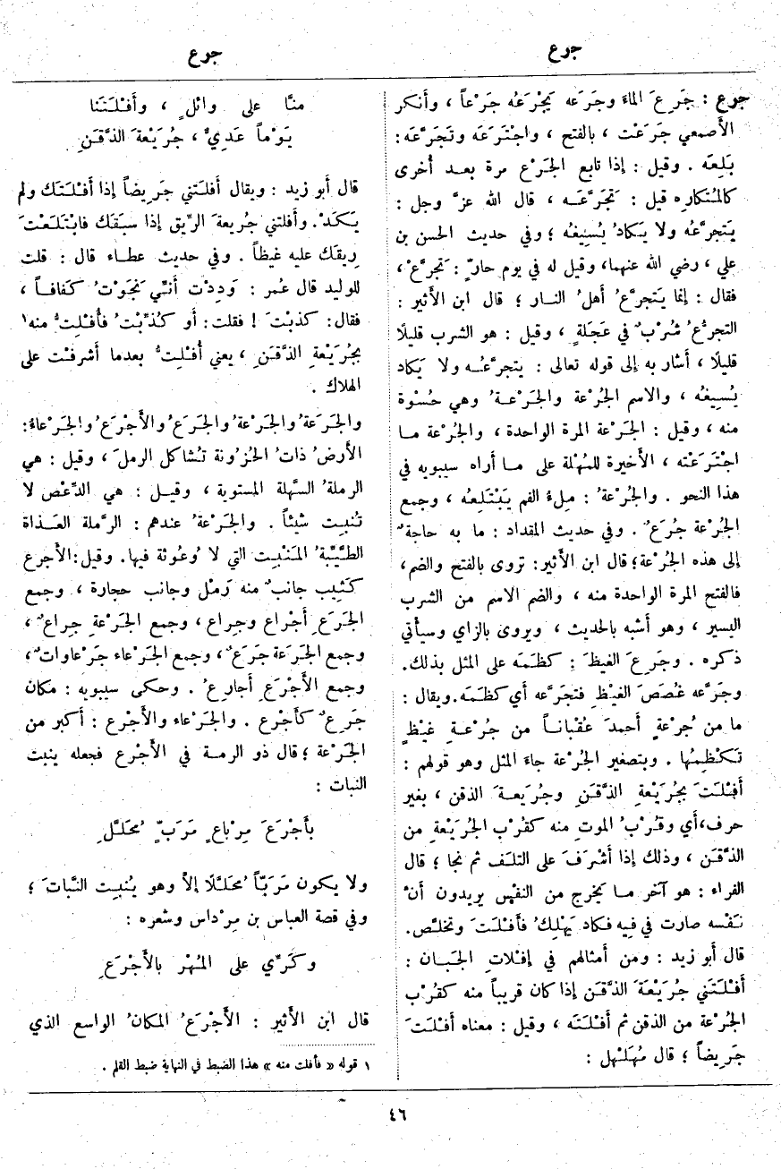 ، يَعْنِي أُفْلِتُّ بعد ما أَشرفْت عَلَى الْهَلَاكِ. والجَرَعةُ والجَرْعةُ والجَرَعُ والأَجْرَعُ والجَرْعاءُ: الأَرضُ ذاتُ الحُزُونة تُشاكل الرملَ، وَقِيلَ: هِيَ الرملةُ السَّهلة الْمُسْتَوِيَةُ، وَقِيلَ: هِيَ الدِّعْص لَا تُنبِت شَيْئًا. والجَرْعةُ عِنْدَهُمْ: الرَّملة العَذاة الطَّيِّبةُ المَنْبِتُ الَّتِي لَا وُعُوثة فِيهَا. وَقِيلَ: الأَجرع كَثِيب جانبٌ مِنْهُ رَمْل وَجَانِبٌ حِجَارَةٌ، وَجَمْعُ الجَرَعِ أَجْراع وجِراع، وَجَمْعُ الجَرْعةِ جِراعٌ، وَجَمْعُ الجَرَعة جَرَعٌ، وَجَمْعُ الجَرْعاء جَرْعاواتٌ، وَجَمْعُ الأَجْرَعِ أَجارِعُ. وَحَكَى سِيبَوَيْهِ: مَكَانٌ جَرِعٌ كأَجْرع. والجَرْعاء والأَجْرع: أَكبر مِنَ الجَرْعة؛ قَالَ ذُو الرُّمَّةِ فِي الأَجْرع فَجَعَلَهُ يُنْبِتُ النَّبَاتَ: