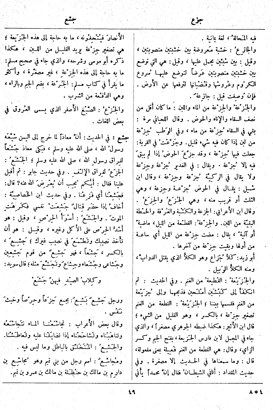 ، غَيْرُ مصغَّرة، وأَكثر مَا يقرأُ فِي كِتَابِ مُسْلِمٍ: الجُرْعة، بِضَمِّ الْجِيمِ وَبِالرَّاءِ، وَهِيَ الدُّفْعةُ مِنَ الشُّرْبِ. والجُزْعُ: الصِّبْغ الأَصفر الَّذِي يُسَمَّى العُروق فِي بعض اللغات.