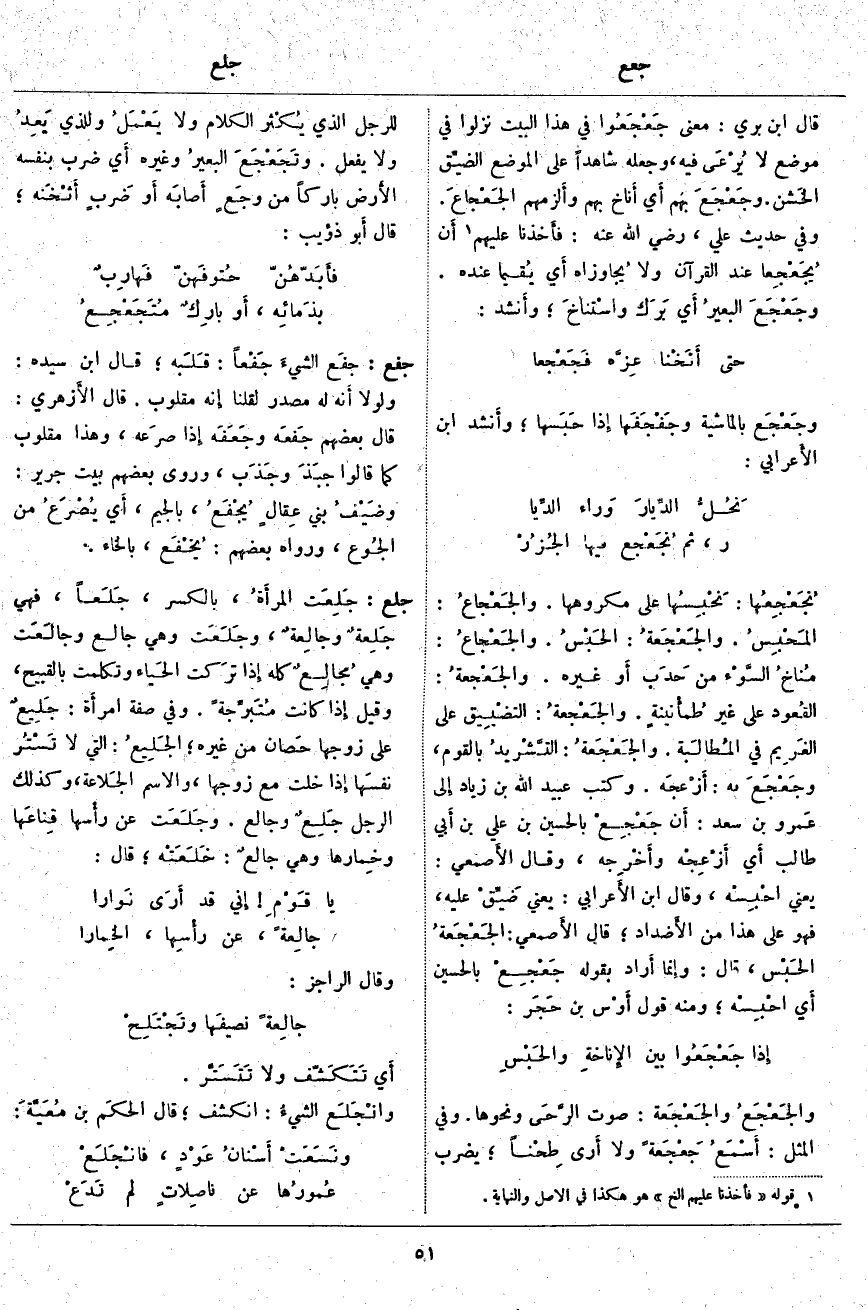جَلَعَ: جَلِعَت المرأَةُ، بِالْكَسْرِ، جَلَعاً، فَهِيَ جَلِعةٌ وجالِعةٌ، وجَلَعَت وَهِيَ جَالِعٌ وجالَعَت وَهِيَ مُجالِعٌ كُلُّهُ إِذَا ترَكت الحَياء وَتَكَلَّمَتْ بِالْقَبِيحِ، وَقِيلَ إِذا كَانَتْ متَبرِّجةً. وَفِي صِفَةِ امرأَة: جَلِيعٌ عَلَى زَوْجِهَا حَصان مِنْ غَيْرِهِ؛ الجَلِيعُ: الَّتِي لَا تَسْتُر نفسَها إِذا خَلَتْ مَعَ زَوْجِهَا، وَالِاسْمُ الجَلاعة، وَكَذَلِكَ الرَّجُلُ جَلِعٌ وَجَالِعٌ. وجَلَعَت عَنْ رأْسها قِناعَها وخِمارها وَهِيَ جالعٌ: خَلَعَتْه؛ قَالَ: