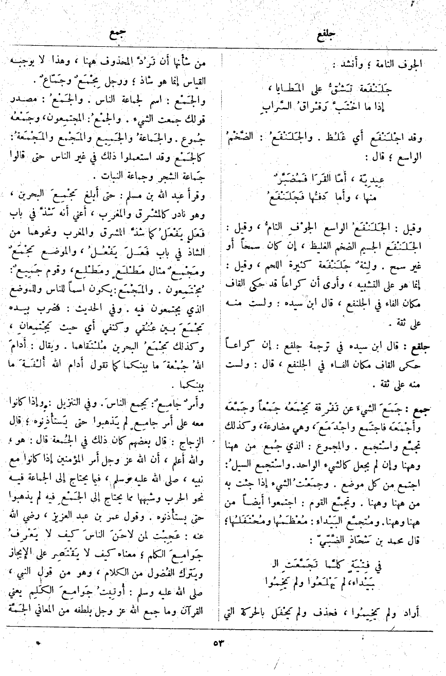 أَراد وَلَمْ يَخِيمُوا، فَحَذَفَ وَلَمْ يَحْفَل بِالْحَرَكَةِ الَّتِي مِنْ شأْنها أَن تَرُدَّ المحذوف هاهنا، وَهَذَا لَا يُوجِبُهُ الْقِيَاسُ إِنما هُوَ شَاذٌّ؛ وَرَجُلٌ مِجْمَعٌ وجَمّاعٌ. والجَمْع: اسْمٌ لِجَمَاعَةِ النَّاسِ. والجَمْعُ: مَصْدَرُ قَوْلِكَ جَمَعْتُ الشَّيْءَ. والجمْعُ: المجتمِعون، وجَمْعُه جُموع. والجَماعةُ والجَمِيع والمَجْمع والمَجْمَعةُ: كالجَمْع وَقَدِ اسْتَعْمَلُوا ذَلِكَ فِي غَيْرِ النَّاسِ حَتَّى قَالُوا جَماعة الشَّجَرِ وَجَمَاعَةُ النَّبَاتِ. وقرأَ عَبْدُ اللَّهِ بْنُ مُسْلِمٍ: