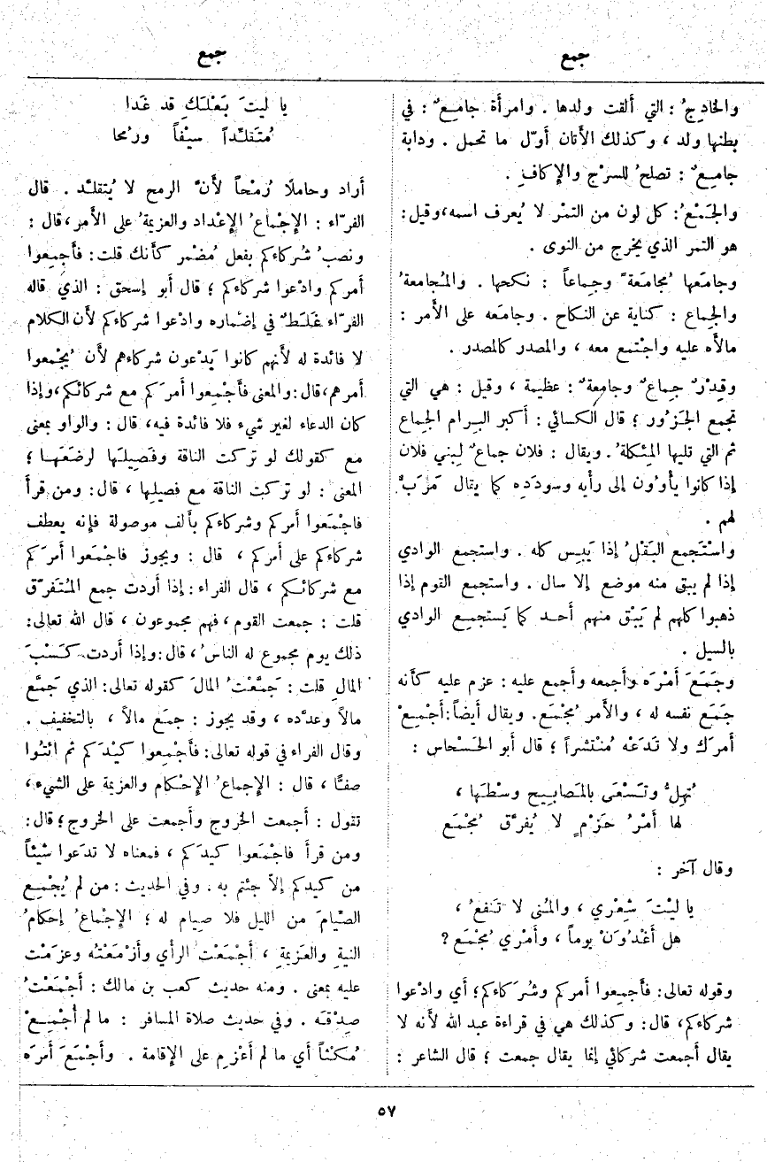 والخادِجُ: الَّتِي أَلقت وَلَدَهَا. وامرأَة جامِعٌ: فِي بَطْنِهَا وَلَدٌ، وَكَذَلِكَ الأَتان أَوّل مَا تَحْمِلُ. وَدَابَّةٌ جامِعٌ: تصلحُ للسرْج والإِكافِ. والجَمْعُ: كُلُّ لَوْنٍ مِنَ التمْر لَا يُعرف اسْمُهُ، وَقِيلَ: هُوَ التَّمْرُ الَّذِي يَخْرُجُ مِنَ النَّوَى. وجامَعها مُجامَعةً وجِماعاً: نَكَحَهَا. والمُجامعةُ والجِماع: كِنَايَةٌ عَنِ النِّكَاحِ. وجامَعه عَلَى الأَمر: مالأَه عَلَيْهِ واجْتمع مَعَهُ، وَالْمَصْدَرُ كَالْمَصْدَرِ. وقِدْرٌ جِماعٌ وجامعةٌ: عَظِيمَةٌ، وَقِيلَ: هِيَ الَّتِي تَجْمَعُ الجَزُور؛ قَالَ الْكِسَائِيُّ: أَكبر البِرام الجِماع ثُمَّ الَّتِي تَلِيهَا المِئكلةُ. وَيُقَالُ: فُلَانٌ جماعٌ لِبني فُلَانٍ إِذا كَانُوا يأْوُون إِلى رأْيه وسودَدِه كَمَا يُقَالُ مَرَبٌّ لَهُمْ. واسْتَجمع البَقْلُ إِذا يَبِس كُلُّهُ. وَاسْتَجْمَعَ الْوَادِي إِذا لَمْ يَبْقَ مِنْهُ مَوْضِعٌ إِلا سَالَ. وَاسْتَجْمَعَ الْقَوْمُ إِذا ذَهَبُوا كُلُّهُمْ لَمْ يَبْق مِنْهُمْ أَحد كَمَا يَستجمِع الْوَادِي بِالسَّيْلِ. وجَمَعَ أَمْرَه وأَجمعه وأَجمع عَلَيْهِ: عَزَمَ عَلَيْهِ كأَنه جَمَع نَفْسَهُ لَهُ، والأَمر مُجْمَع. وَيُقَالُ أَيضاً: أَجْمِعْ أَمرَك وَلَا تَدَعْه مُنْتشراً؛ قَالَ أَبو الحَسْحاس: