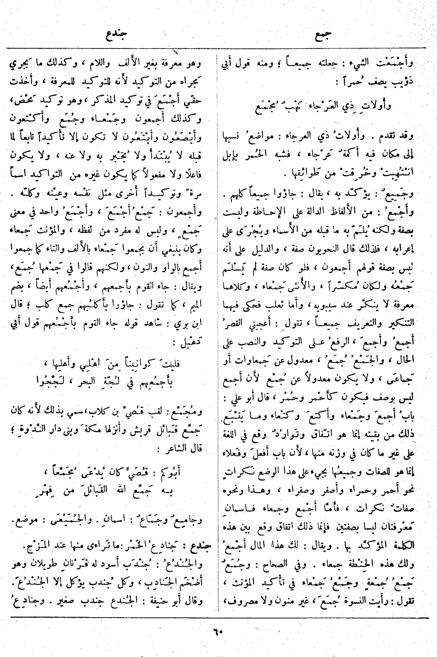 وَقَدْ تَقَدَّمَ. وأُولاتُ ذِي الْعَرْجَاءِ: مواضعُ نَسَبَهَا إِلى مَكَانٍ فِيهِ أَكمةٌ عَرْجاء، فَشَبَّهَ الحُمر بإِبل انْتُهِبتْ وخُرِقتْ مِنْ طَوائِفها. وجَمِيعٌ: يُؤَكَّدُ به، يقال: جاؤوا جَمِيعًا كُلُّهُمْ. وأَجْمعُ: مِنَ الأَلفاظ الدَّالَّةِ عَلَى الإِحاطة وَلَيْسَتْ بِصِفَةٍ وَلَكِنَّهُ يُلَمّ بِهِ مَا قَبْلَهُ مِنَ الأَسماء ويُجْرَى عَلَى إِعرابه، فَلِذَلِكَ قَالَ النَّحْوِيُّونَ صِفَةٌ، وَالدَّلِيلُ عَلَى أَنه لَيْسَ بِصِفَةٍ قَوْلُهُمْ أَجمعون، فَلَوْ كَانَ صِفَةً لَمْ يَسْلَم جَمْعُه وَلَكَانَ مُكسّراً، والأُنثى جَمْعاء، وَكِلَاهُمَا مَعْرِفَةٌ لَا ينكَّر عِنْدَ سِيبَوَيْهِ، وأَما ثَعْلَبٌ فَحَكَى فِيهِمَا التَّنْكِيرَ وَالتَّعْرِيفَ جَمِيعًا، تَقُولُ: أَعجبني القصرُ أَجمعُ وأَجمعَ، الرفعُ عَلَى التَّوْكِيدِ وَالنَّصْبُ عَلَى الْحَالِ، والجَمْعُ جُمَعُ، مَعْدُولٌ عَنْ جَمعاوات أَو جَماعَى، وَلَا يَكُونُ مَعْدُولًا عَنْ جُمْع لأَن أَجمع لَيْسَ بوصف فيكون كأَحْمر وحُمْر، قَالَ أَبو عَلِيٍّ: بابُ أَجمعَ وجَمْعاء وأَكتعَ وكتْعاء وَمَا يَتْبَع ذَلِكَ مِنْ بَقِيَّتِهِ إِنما هُوَ اتِّفَاقٌ وتَوارُدٌ وَقَعَ فِي اللُّغَةِ عَلَى غَيْرِ مَا كَانَ فِي وَزْنِهِ مِنْهَا، لأَن بَابَ أَفعلَ وفَعلاء إِنما هُوَ لِلصِّفَاتِ وجميعُها يَجِيءُ عَلَى هَذَا الْوَضْعِ نَكراتٍ نَحْوَ أَحمر وَحَمْرَاءَ وأَصفر وَصَفْرَاءَ، وَهَذَا وَنَحْوُهُ صفاتٌ نَكِرَاتٌ، فأَمَّا أَجْمع وَجَمْعَاءَ فاسمانِ مَعْرفَتان لَيْسَا بِصِفَتَيْنِ فإِنما ذَلِكَ اتِّفَاقٌ وَقَعَ بَيْنَ هَذِهِ الْكَلِمَةِ المؤكَّد بِهَا. وَيُقَالُ: لَكَ هَذَا الْمَالُ أَجْمعُ وَلَكَ هَذِهِ الحِنْطة جَمْعَاءُ. وَفِي الصِّحَاحِ: وجُمَعٌ جَمْعُ جُمْعةٍ وجَمْعُ جَمْعاء فِي تأْكيد الْمُؤَنَّثِ، تَقُولُ: رأَيت النِّسْوَةَ جُمَعَ، غَيْرَ مُنَوَّنٍ وَلَا مَصْرُوفٍ، وَهُوَ مَعْرِفَةٌ بِغَيْرِ الأَلف وَاللَّامِ، وَكَذَلِكَ مَا يَجري مَجراه منه التَّوْكِيدِ لأَنه لِلتَّوْكِيدِ لِلْمَعْرِفَةِ، وأَخذت حَقِّي أَجْمَعَ فِي تَوْكِيدِ الْمُذَكَّرِ، وَهُوَ تَوْكِيدٌ مَحْض، وَكَذَلِكَ أَجمعون وجَمْعاء وجُمَع وأَكْتعون وأَبْصَعُون وأَبْتَعُون لَا تَكُونُ إِلا تأْكيداً تَابِعًا لِمَا قَبْلَهُ لَا يُبْتَدأُ وَلَا يُخْبر بِهِ وَلَا عَنْهُ، وَلَا يَكُونُ فَاعِلًا وَلَا مَفْعُولًا كَمَا يَكُونُ غَيْرُهُ مِنَ التَّوَاكِيدِ اسْمًا مَرَّةً وَتَوْكِيدًا أُخرى مِثْلَ نفْسه وعيْنه وَكُلِّهِ وأَجمعون: جَمْعُ أَجْمَعَ، وأَجْمَعُ وَاحِدٌ فِي مَعْنَى جَمْعٍ، وَلَيْسَ لَهُ مُفْرَدٌ مِنْ لَفْظِهِ، وَالْمُؤَنَّثُ جَمعاء وَكَانَ يَنْبَغِي أَن يَجْمَعُوا جَمْعاء بالأَلف وَالتَّاءِ كَمَا جَمَعُوا أَجمع بِالْوَاوِ وَالنُّونِ، وَلَكِنَّهُمْ قَالُوا فِي جَمْعها جُمَع، وَيُقَالُ: جَاءَ الْقَوْمُ بأَجمعهم، وأَجْمُعهم أَيضاً، بِضَمِّ الْمِيمِ، كما تقول: جاؤوا بأَكلُبهم جَمْعُ كَلْبٍ؛ قَالَ ابْنُ بَرِّيٍّ: شَاهِدُ قَوْلِهِ جَاءَ الْقَوْمُ بأَجْمُعهم قَوْلُ أَبي دَهْبل: