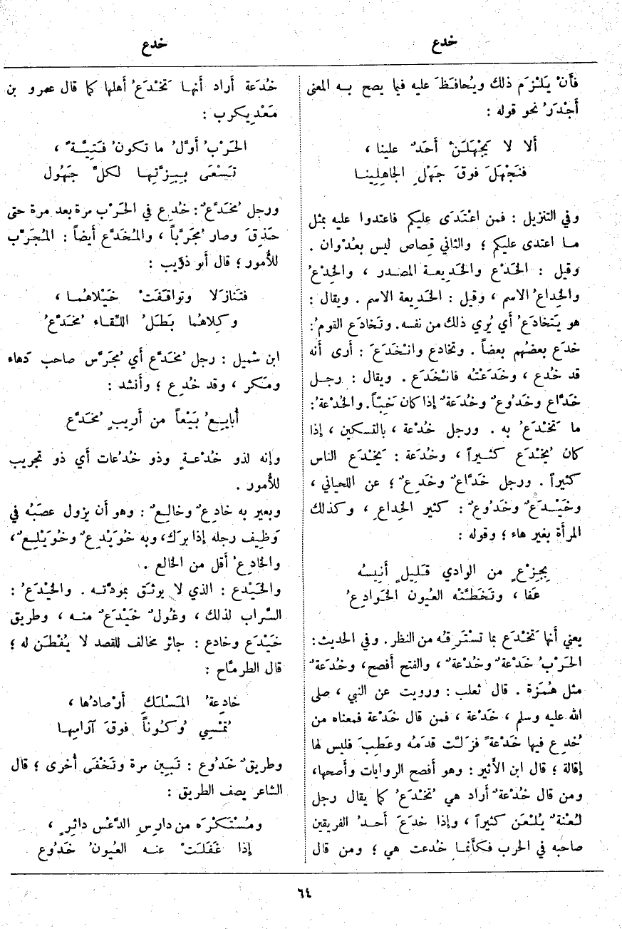 وَفِي التَّنْزِيلِ: فَمَنِ اعْتَدى عَلَيْكُمْ فَاعْتَدُوا عَلَيْهِ بِمِثْلِ مَا اعْتَدى عَلَيْكُمْ؛ وَالثَّانِي قِصاص لَيْسَ بعُدْوان. وَقِيلَ: الخَدْع والخَدِيعة الْمَصْدَرُ، والخِدْعُ والخِداعُ الِاسْمُ، وَقِيلَ الخَدِيعَةُ الِاسْمُ. وَيُقَالُ: هُوَ يَتخادَعُ أَي يُري ذَلِكَ مِنْ نَفْسِهِ. وتَخادَع القومُ: خدَع بعضُهم بَعْضًا. وَتَخَادَعَ وانْخَدَعَ: أَرى أَنه قَدْ خُدع، وخَدَعْتُه فانْخَدَع. وَيُقَالُ: رَجُلٌ خَدَّاع وخَدُوعٌ وخُدَعةٌ إِذا كان خِبّاً [خَبّاً]. والخُدْعةُ: مَا تَخْدَعُ بِهِ. وَرَجُلٌ خُدْعة، بِالتَّسْكِينِ، إِذا كَانَ يُخْدَع كَثِيرًا، وخُدَعة: يَخْدَع النَّاسَ كَثِيرًا. وَرَجُلٌ خَدَّاعٌ وخَدِعٌ؛ عَنِ اللِّحْيَانِيِّ، وخَيْدَعٌ وخَدُوعٌ: كَثِيرُ الخِداعِ، وَكَذَلِكَ المرأَة بِغَيْرِ هَاءٍ؛ وَقَوْلُهُ: