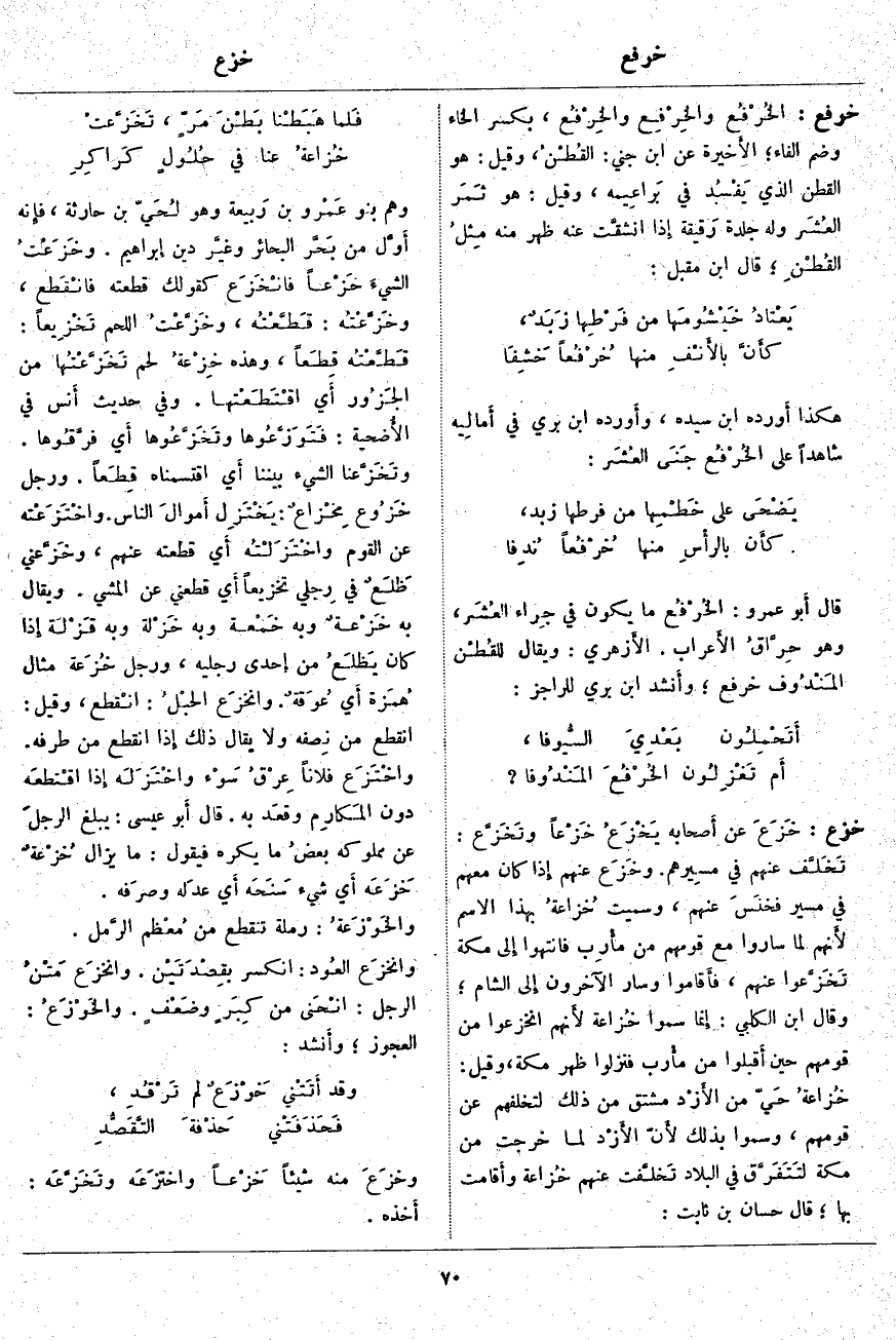 خزع: خَزَعَ عَنْ أَصحابه يَخْزَعُ خَزْعاً وتَخَزَّع: تَخَلَّف عَنْهُمْ فِي مسِيرهم. وخَزَع عَنْهُمْ إِذا كَانَ مَعَهُمْ فِي مَسِيرٍ فخنَسَ عَنْهُمْ، وَسُمِّيَتْ خُزاعةُ بِهَذَا الِاسْمِ لأَنهم لَمَّا سَارُوا مَعَ قَوْمِهِمْ مِنْ مأْرِب فَانْتَهَوْا إِلى مَكَّةَ تَخَزَّعوا عَنْهُمْ، فأَقاموا وَسَارَ الْآخَرُونَ إِلى الشَّامِ؛ وَقَالَ ابْنُ الْكَلْبِيِّ: إِنما سُمُّوا خُزاعة لأَنهم انْخَزَعُوا مِنْ قَوْمِهِمْ حِينَ أَقبلوا مِنْ مأْرب فَنَزَلُوا ظَهْرَ مَكَّةَ، وَقِيلَ: خُزاعةُ حَيّ مِنَ الأَزْد مُشْتَقٌّ مِنْ ذَلِكَ لِتَخَلُّفِهِمْ عَنْ قَوْمِهِمْ، وَسُمُّوا بِذَلِكَ لأَنّ الأَزْد لَمَّا خَرَجَتْ مِنْ مَكَّةَ لتَتَفَرَّق فِي الْبِلَادِ تَخلَّفت عَنْهُمْ خُزاعة وأَقامت بِهَا. قَالَ حَسَّانُ بْنُ ثَابِتٍ: