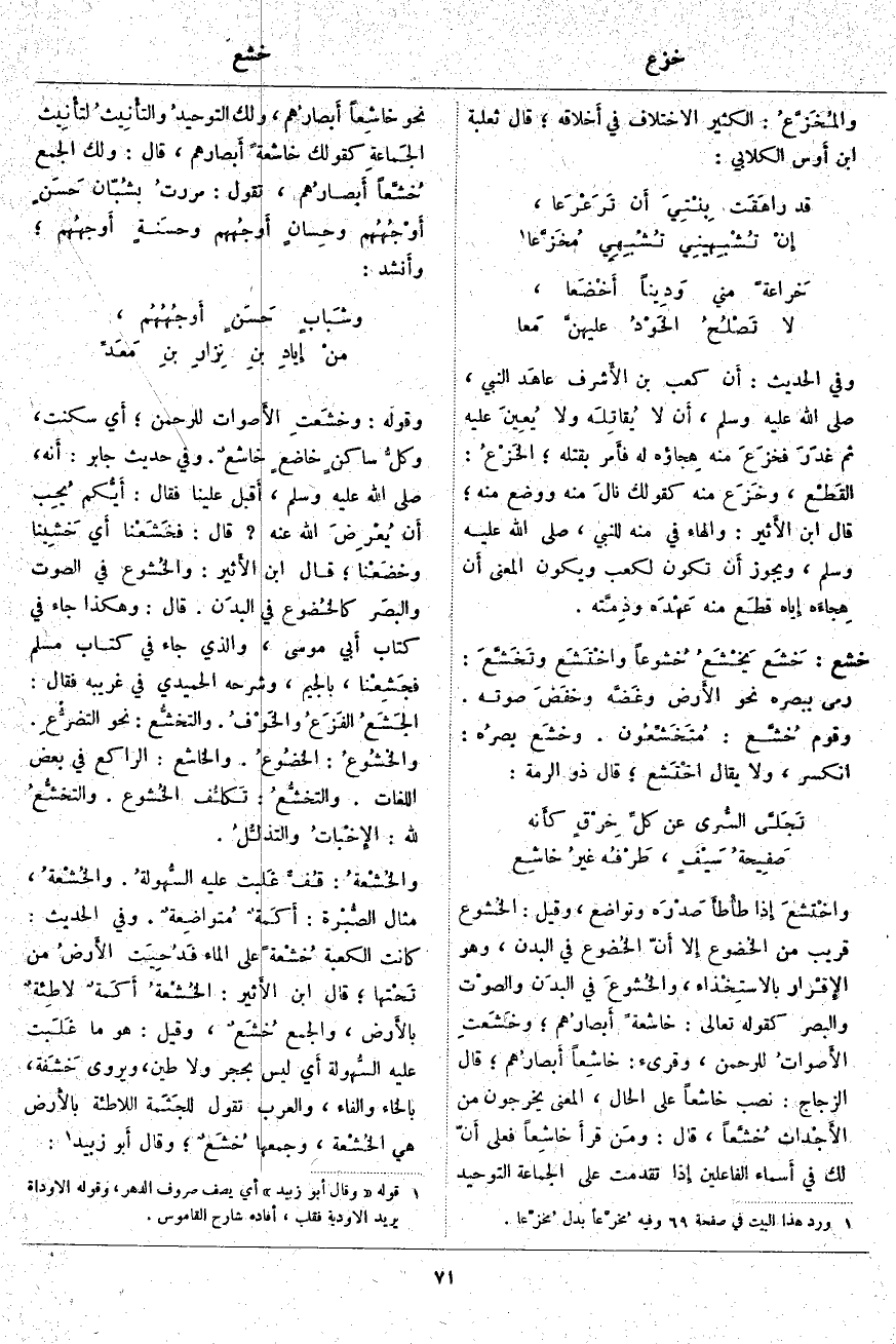 خشع: خَشَع يَخْشَعُ خُشوعاً واخْتَشَع وتَخَشَّعَ: رَمَى بِبَصَرِهِ نَحْوَ الأَرض وغَضَّه وخفَضَ صَوْتَهُ. وَقَوْمٌ خُشَّع: مُتَخَشِّعُون. وخشَع بصرُه: انْكَسَرَ، وَلَا يُقَالُ اخْتَشع؛ قَالَ ذُو الرُّمَّةِ: