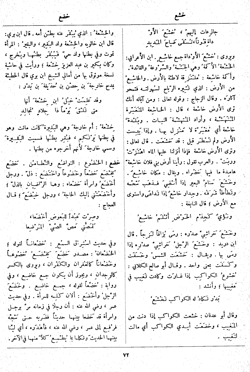 وَقَالَ أَبو عَدْنَانَ: خَشَعَتِ الْكَوَاكِبُ إِذا دَنَتْ مِنَ المَغِيب، وخضَعَت أَيدي الْكَوَاكِبِ أَي مَالَتْ لتَغِيب. والخِشْعةُ: الَّذِي يُبْقر عَنْهُ بطْن أُمه. قَالَ ابْنُ بَرِّيٍّ: قَالَ ابْنُ خَالَوَيْهِ والخِشْعة وَلَدُ البَقِير، والبقيرُ: المرأَة تَمُوتَ وَفِي بَطْنِهَا وَلَدٌ حَيٌّ فَيُبْقَر بطنُها ويُخرج، وَكَانَ بِكِيرُ بْنُ عَبْدِ الْعَزِيزِ خِشْعة؛ ورأَيت فِي حَاشِيَةِ نُسْخَةٍ مَوْثُوقٍ بِهَا مِنْ أَمالي الشَّيْخِ ابْنِ بَرِّيٍّ قَالَ الْحُطَيْئَةُ يَمْدَحُ خارِجةَ بْنَ حِصْن بْنُ حُذَيفةَ بْنِ بَدْر: