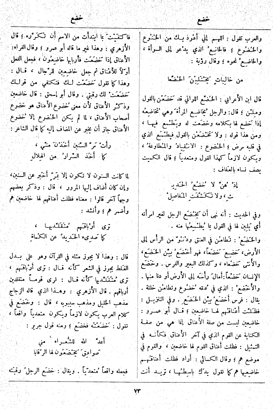قَالَ: وَهَذَا لَا يَجُوزُ مِثْلُهُ فِي الْقُرْآنِ وَهُوَ عَلَى بَدَلِ الغَلط يَجُوزُ فِي الشِّعْرِ كأَنه قَالَ: تَرَى أَرْباقَهم، تَرَى مُتَقَلِّديها كأَنه قَالَ: تَرَى قَوْمًا مُتقلدين أَرباقهم. قَالَ الأَزهري: وَهَذَا الَّذِي قَالَهُ الزَّجَّاجُ مَذْهَبُ الْخَلِيلِ وَمَذْهَبُ سِيبَوَيْهِ، قَالَ: وخَضَع فِي كَلَامِ الْعَرَبِ يَكُونُ لَازِمًا وَيَكُونُ مُتَعَدِّيًا وَاقِعًا، تَقُولُ: خَضَعْتُه فخضَع؛ وَمِنْهُ قَوْلُ جَرِيرٍ: