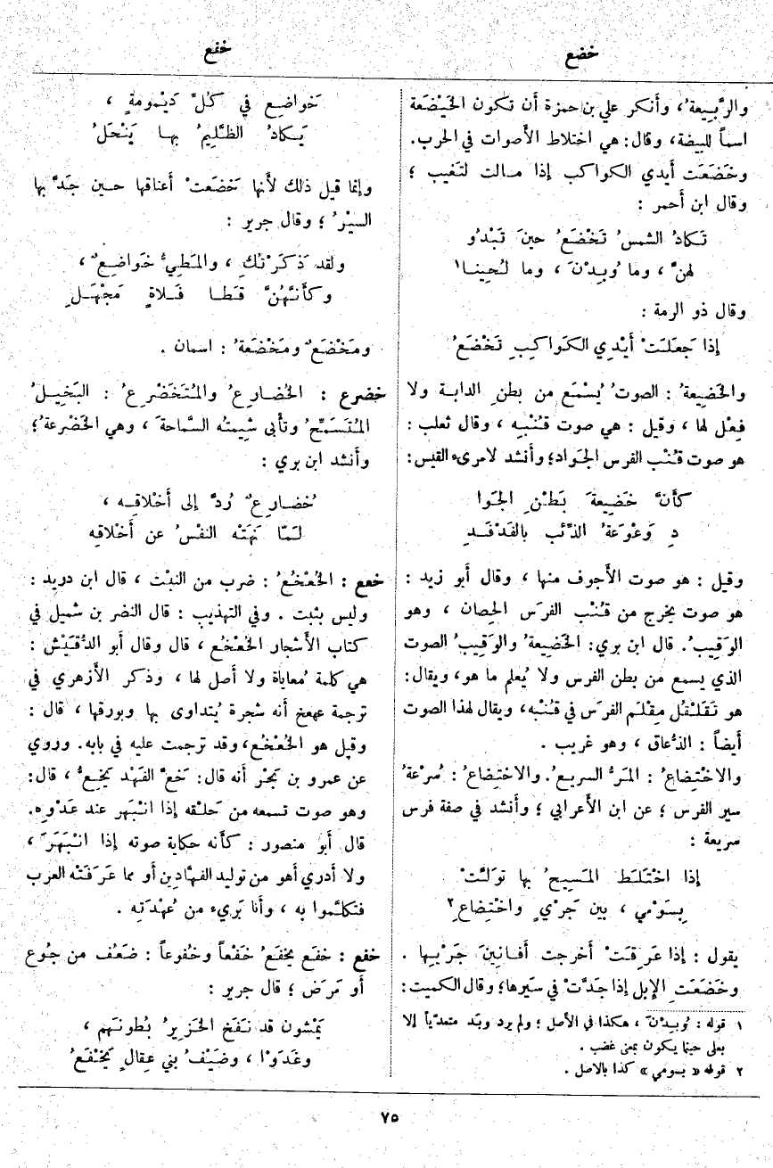 خعع: الخُعْخُعُ: ضَرْبٌ مِنَ النبْت، قَالَ ابْنُ دُرَيْدٍ: وَلَيْسَ بِثَبْتٍ. وَفِي التَّهْذِيبِ: قَالَ النَّضْرُ بْنُ شُمَيْلٍ فِي كِتَابِ الأَشجار الخُعْخُع، قَالَ وَقَالَ أَبو الدُّقَيْش: هِيَ كَلِمَةٌ مُعاياة وَلَا أَصل لَهَا، وَذَكَرَ الأَزهري فِي تَرْجَمَةِ عَهَعَخَ أَنه شَجَرَةٌ يُتداوى بِهَا وَبِوَرَقِهَا، قَالَ: وَقِيلَ هُوَ الخُعْخُع، وَقَدْ تُرْجِمَتْ عَلَيْهِ فِي بَابِهِ. وَرُوِيَ عَنْ عَمْرِو بْنِ بَحْر أَنه قَالَ: خَعَّ الفَهْد يَخِعُّ، قَالَ: وَهُوَ صَوْتٌ تَسْمَعُهُ مِنْ حَلْقه إِذا انْبَهر عِنْدَ عَدْوِه. قَالَ أَبو مَنْصُورٍ: كأَنه حِكَايَةُ صَوْتِهِ إِذا انْبَهَرَ، وَلَا أَدري أَهو مِنْ تَوْلِيدِ الفَهَّادِين أَو مِمَّا عَرَفَتْه الْعَرَبُ فتكلَّموا بِهِ، وأَنا بَريء مِنْ عُهْدَتِه.