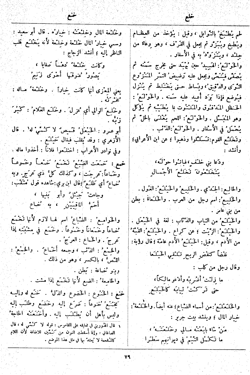 يَعْنِي المِعْزى أَنها كَانَتْ خِياراً. وخُلْعةُ مَالِهِ: مُخْرَتُه. وخُلِعَ الْوَالِي أَي عُزِلَ. وخَلَع الغُلامُ: كَبُرَ زُبُّه. أَبو عَمْرٍو: الخَيْعَلُ قَمِيصٌ لَا كُمَّيْ لَهُ «2». قَالَ الأَزهري: وَقَدْ يُقلب فَيُقَالُ خَيْلَع. وَفِي نَوَادِرِ الأَعراب: اختلَعوا فلاناً: أَخذوا ماله.