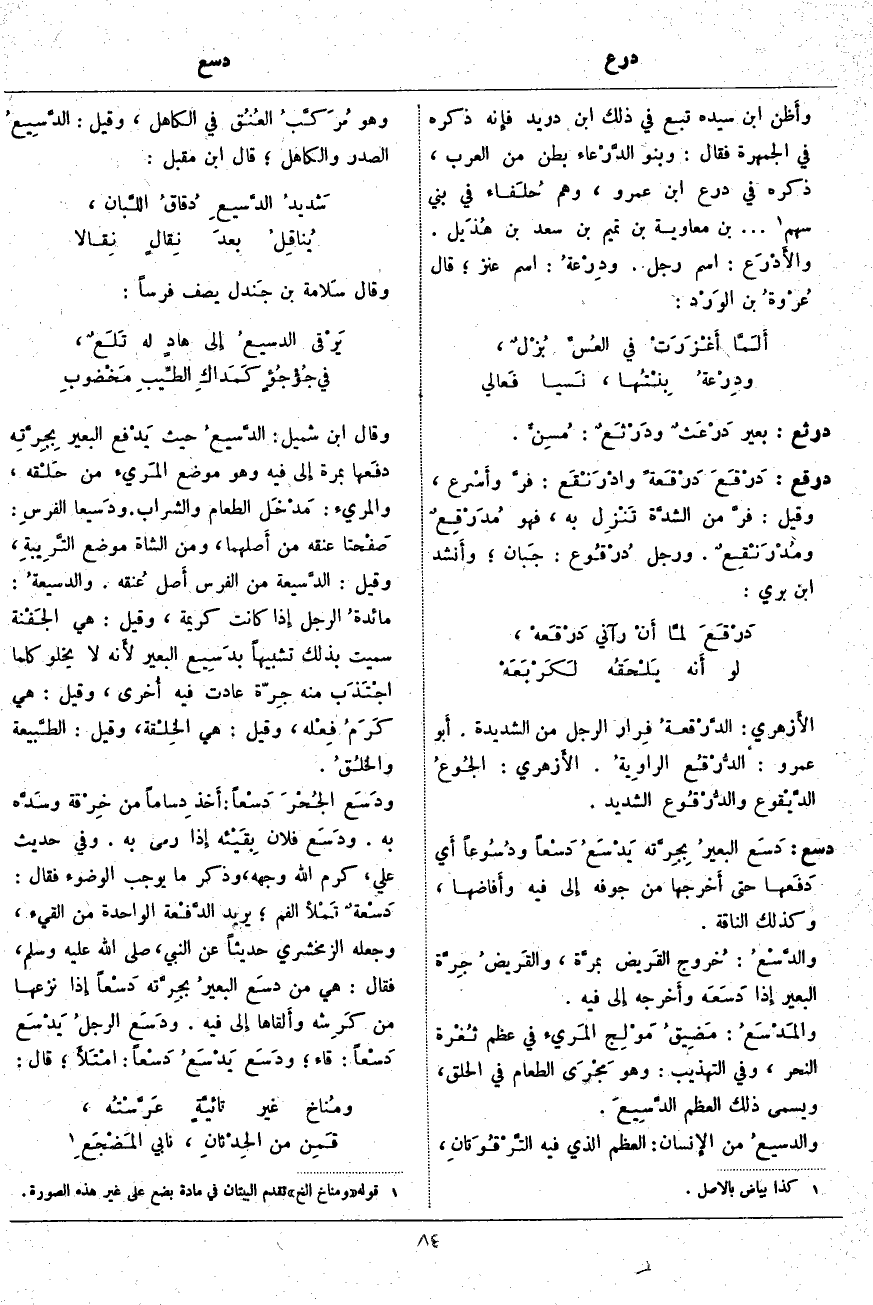 وَقَالَ ابْنُ شُمَيْلٍ: الدَّسيعُ حَيْثُ يَدْفع الْبَعِيرُ بِجِرَّتِه دفَعها بِمَرَّةٍ إِلى فِيهِ وَهُوَ مَوْضِعُ المَريء مِنْ حَلْقه، وَالْمَرِيءُ: مَدْخَل الطَّعَامِ وَالشَّرَابِ. ودَسيعا الفرسِ: صَفْحتا عنقه. من أَصلهما، وَمِنَ الشَّاةِ مَوْضِعُ التَّرِيبةِ، وَقِيلَ: الدَّسيعة مِنَ الْفَرَسِ أَصل عُنقه والدسيعةُ: مائدةُ الرَّجُلِ إِذا كَانَتْ كَرِيمَةً، وَقِيلَ: هِيَ الجَفْنة سُمِّيَتْ بِذَلِكَ تَشْبِيهًا بدَسِيع الْبَعِيرِ لأَنه لَا يَخْلُو كُلَّمَا اجْتَذَب مِنْهُ جِرّة عَادَتْ فِيهِ أُخرى، وَقِيلَ: هِيَ كَرَمُ فِعْله، وَقِيلَ: هِيَ الخِلْقة، وَقِيلَ: الطَّبيعة والخلُقُ. ودَسَع الجُحْرَ دَسْعاً: أَخذ دِساماً مِنْ خِرْقة وسَدَّه بِهِ. ودَسَع فُلَانٌ بِقَيْئه إِذا رَمَى بِهِ. وَفِي حَدِيثِ