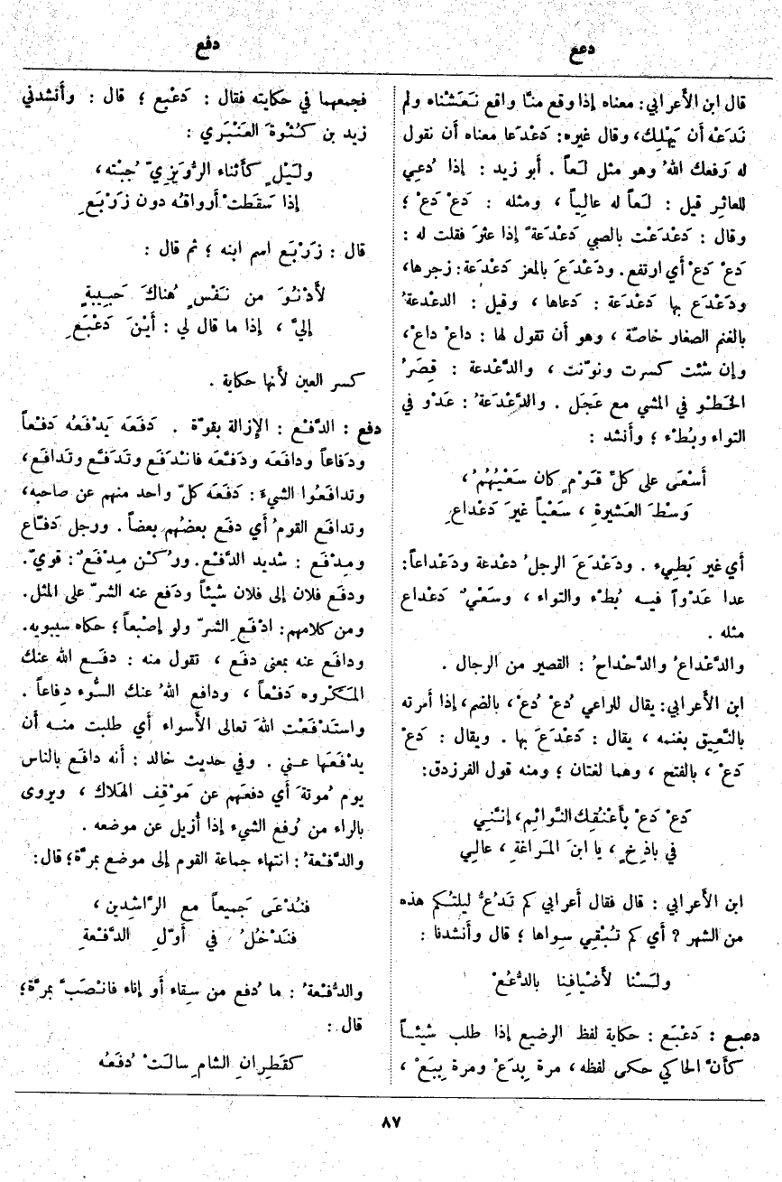 دفع: الدَّفْع: الإِزالة بِقُوَّةٍ. دَفَعَه يَدْفَعُه دَفْعاً ودَفاعاً ودافَعَه ودَفَّعَه فانْدَفَع وتَدَفَّع وتَدافَع، وتدافَعُوا الشيءَ: دَفَعَه كُلُّ وَاحِدٍ مِنْهُمْ عَنْ صَاحِبِهِ، وتدافَع القومُ أَي دفَع بعضُهم بَعْضًا. وَرَجُلٌ دَفّاع ومِدْفَع: شَدِيدُ الدَّفْع. ورُكْن مِدْفَعٌ: قَوِيٌّ. ودفَع فُلَانٌ إِلى فُلَانٍ شَيْئًا ودَفع عَنْهُ الشَّرَّ عَلَى الْمَثَلِ. وَمِنْ كَلَامِهِمْ: ادْفَعِ الشَّرَّ وَلَوْ إِصْبعاً؛ حَكَاهُ سِيبَوَيْهِ. ودافَع عَنْهُ بِمَعْنَى دفَع، تَقُولُ مِنْهُ: دفَع اللَّهُ عَنْكَ المَكْروه دَفْعاً، وَدَافَعَ اللهُ عَنْكَ السُّوء دِفاعاً. واستَدْفَعْت اللهَ تَعَالَى الأَسواء أَي طَلَبْتُ مِنْهُ أَن يَدْفَعَها عَنِّي. وَفِي حَدِيثِ
